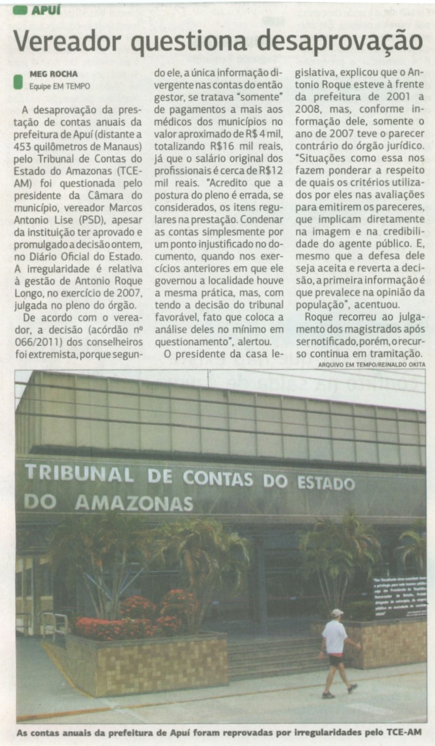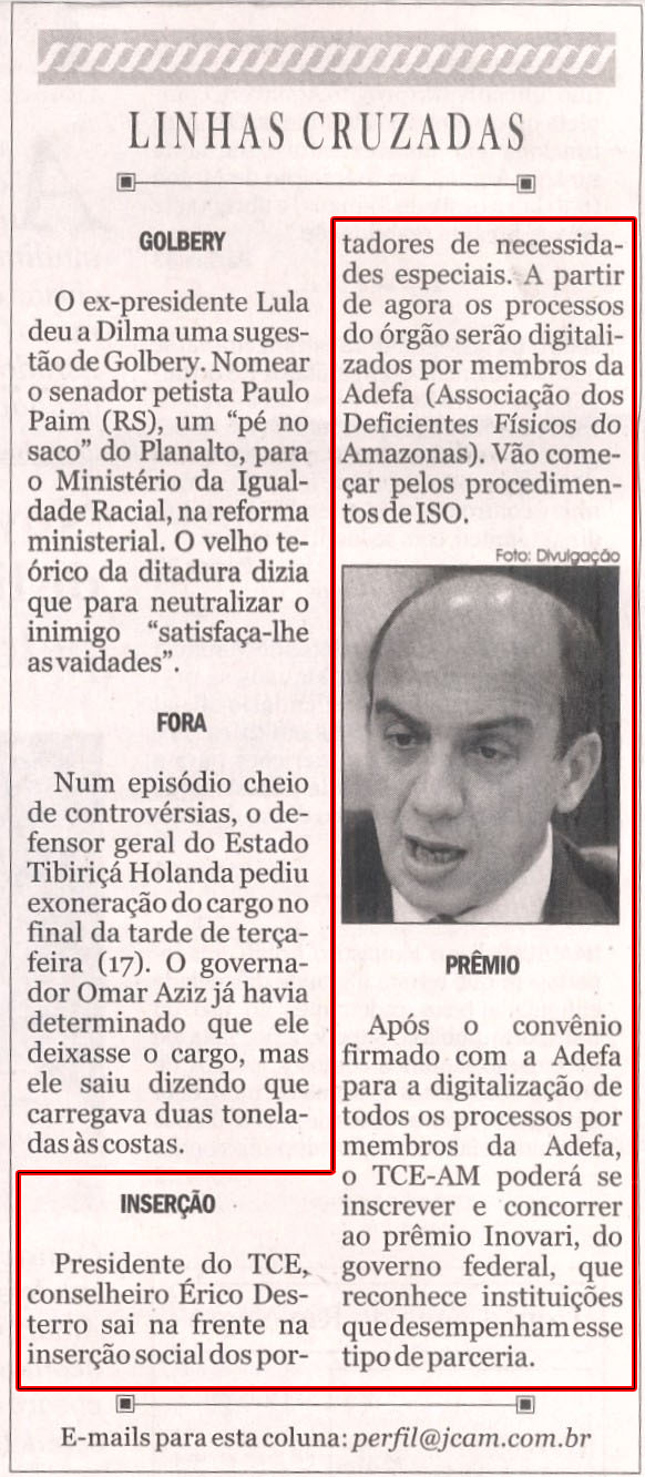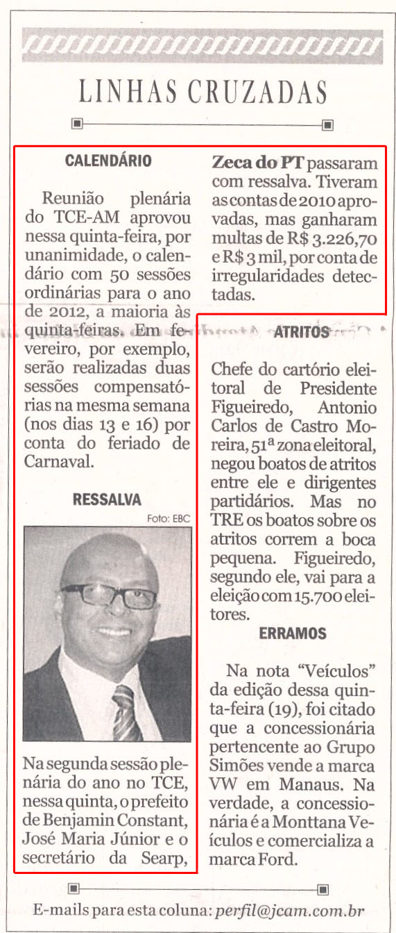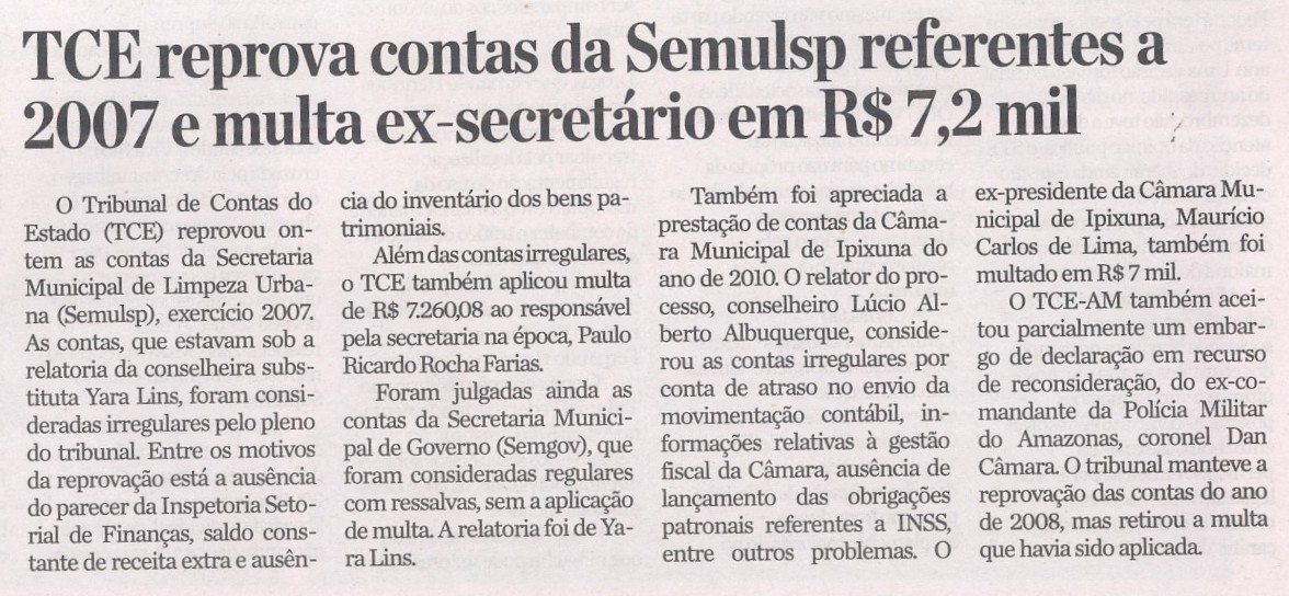 20/01/12 Diário do Amazonas TCE reprova contas da Semulsp referentes a 2007 e multa ex-secretário em R$ 7,2 mil