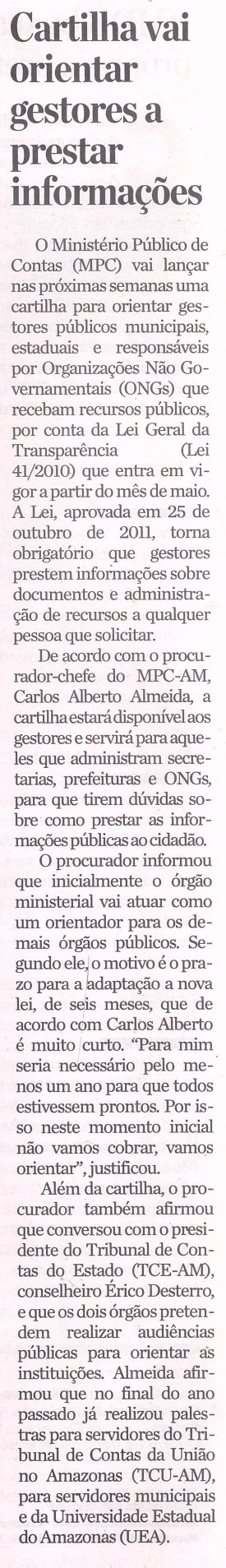 16/01/12 Diário do Amazonas Cartilha vai orientar gestores a prestar informações