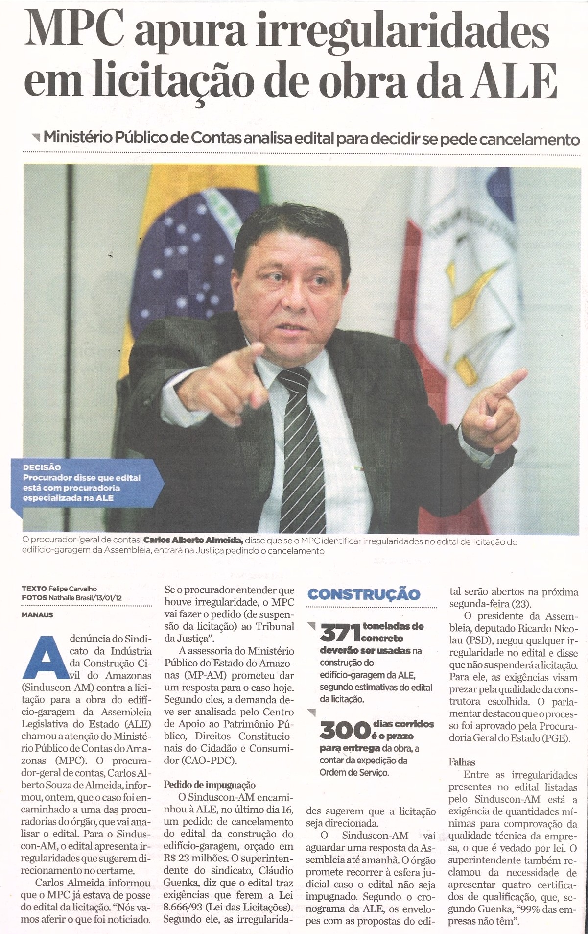 18/01/12 Diário do Amazonas MPC apura irregularidades em licitação de obra da ALE
