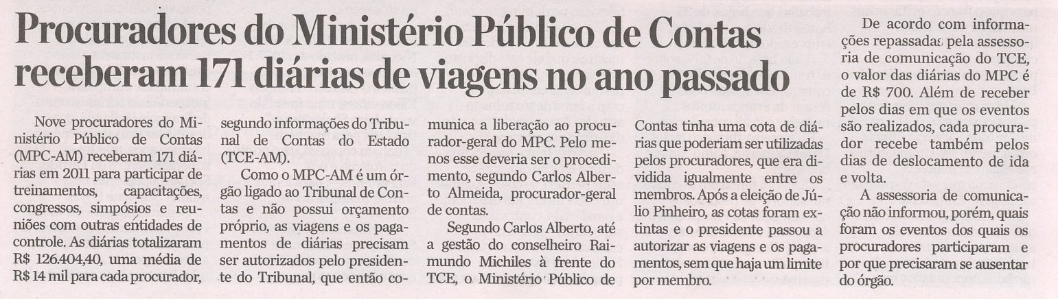 31/01/12 Diário do Amazonas Procuradores do Ministério Público de Contas receberam 171 diárias de viagens no ano passado