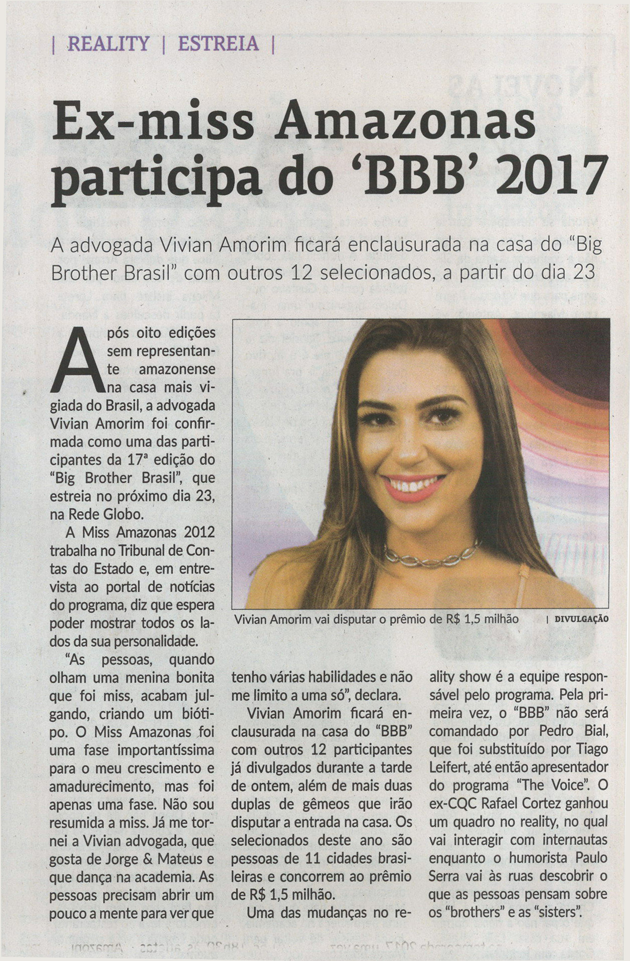19/01/17 Em Tempo  Ex-miss Amazonas participa do 'BBB' 2017