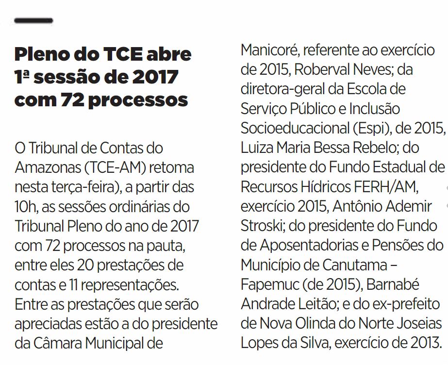 31/01/17 Diário do Amazonas Pleno do TCE abre 1ª sessão de 2017 com 72 processos