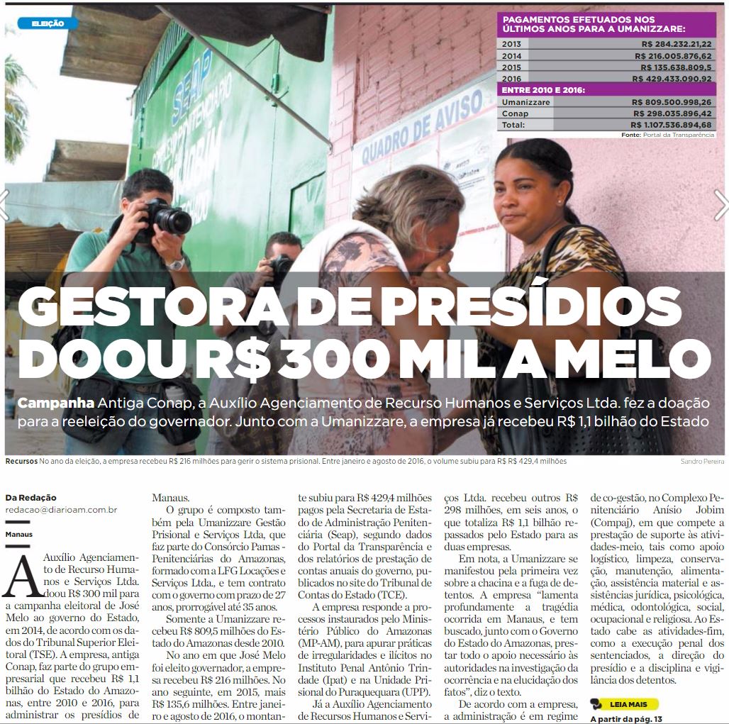 04/01/17 Diário do Amazonas Gestora de presídiarios doou R$ 300 mil a Melo