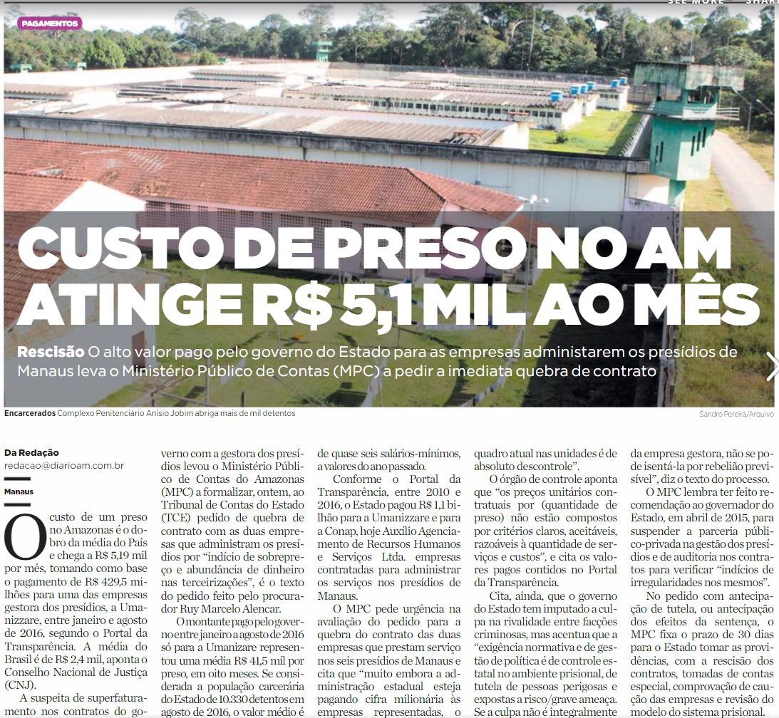 05/01/17 Diário do Amazonas Custo de preso no AM atinge R$ 5,1 mil ao mês