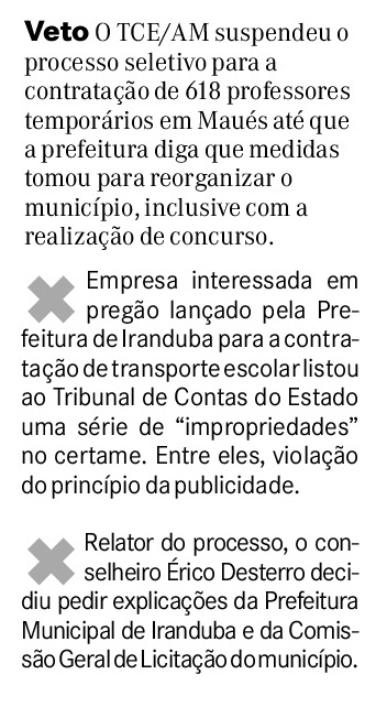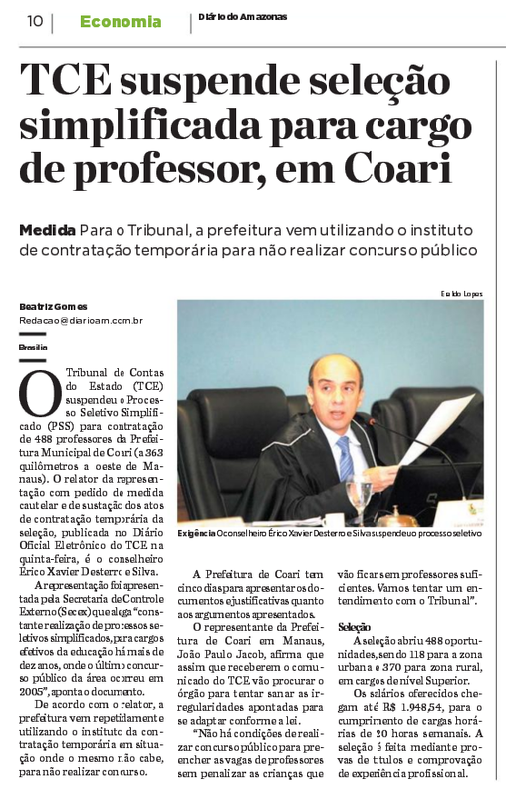 TCE suspende seleção simplificada para cargo de professor, em Coari