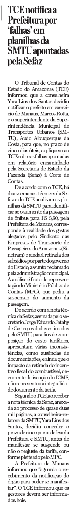 TCE notifica prefeitura por 'falhas' em planilhas da SMTU apontadas pela SEFAZ