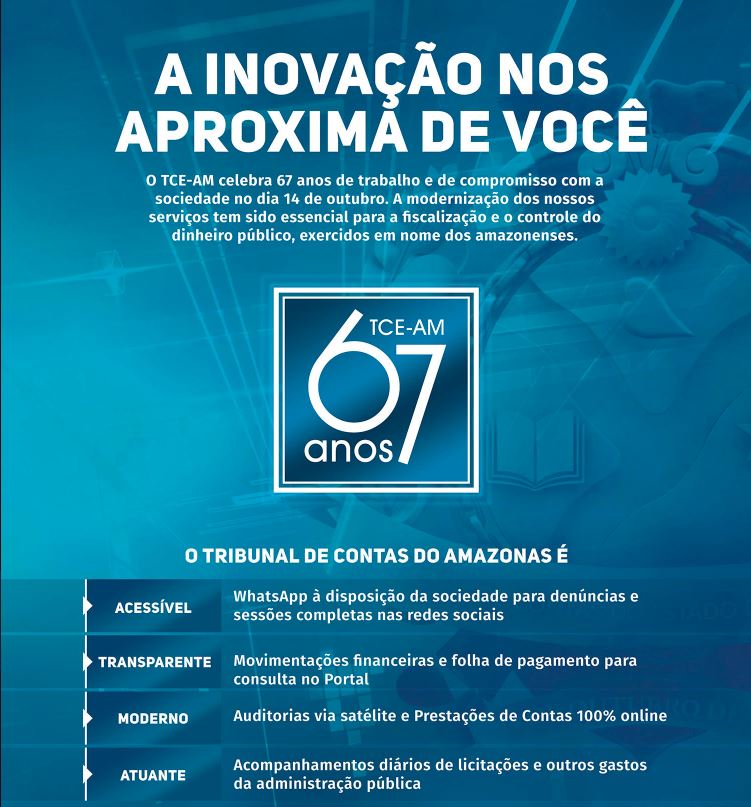 Fundado em 14 de outubro de 1950, o Tribunal de Contas do Estado do Amazonas (TCE-AM) chega aos 67 anos, no próximo sábado, festejando avanços em vários setores e modernizações nos procedimentos, entre eles o início das auditorias via satélite e a padronização das auditorias.