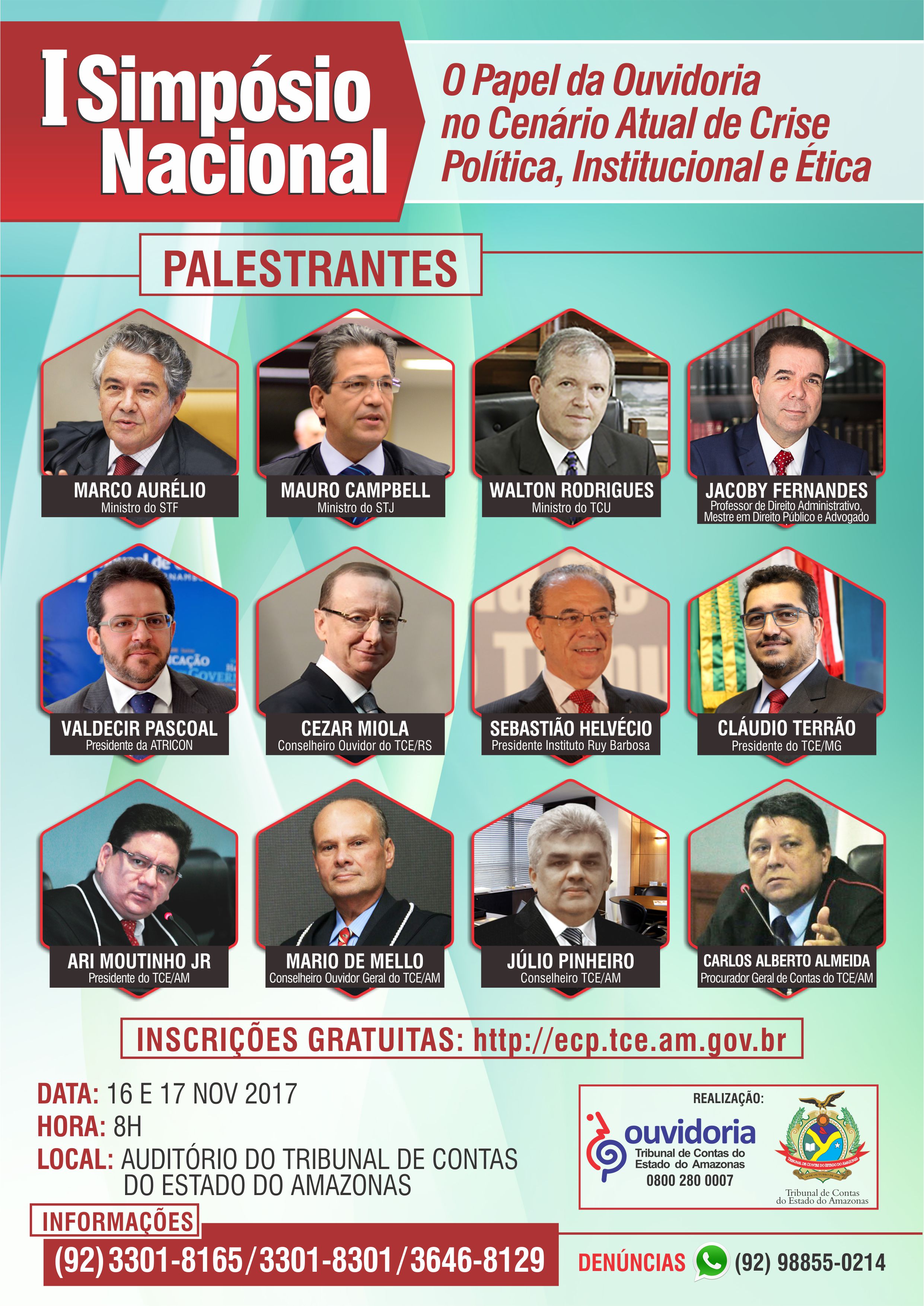 O Tribunal de Contas do Amazonas (TCE-AM) sediará, nos dias 16 e 17 de novembro, a primeira edição nacional do Simpósio sobre o Papel da Ouvidoria no Cenário Atual de Crise Política, Institucional e Ética pela qual atravessa o país. O evento terá a participação de representantes de Ouvidorias de todo o país, além grandes nomes do cenário jurídico e de órgãos públicos do Estado e dos municípios.