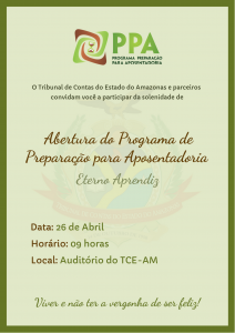 O Tribunal de Contas do Estado (TCE-AM), por meio do Departamento de Gestão de Pessoas (Degesp), promove nesta sexta-feira (26) a abertura da 9ª edição do Programa Preparação para Aposentadoria “Eterno Aprendiz” (PPA). O evento será realizado a partir 9h, no auditório da Corte de Contas, tem apoio da presidente do TCE, Yara Lins dos Santos.