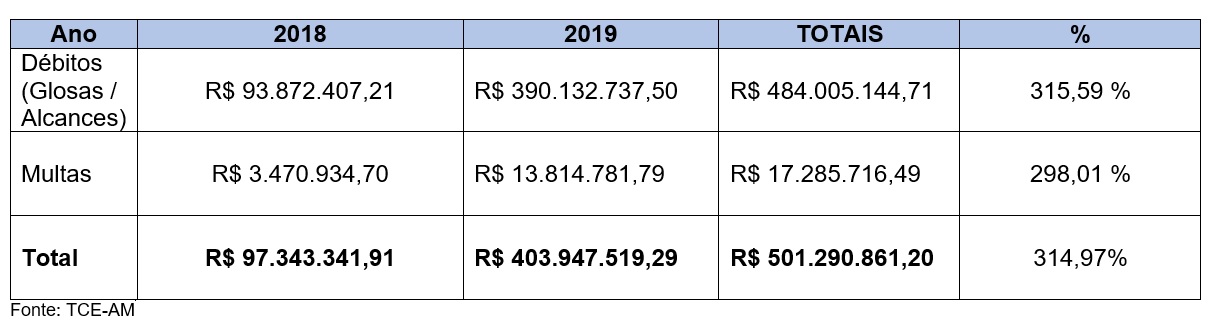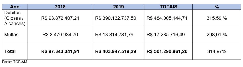 No ano de 2018, o Tribunal contabilizou R$ 93,8 milhões em débitos gerais aplicados (glosas e alcance). Este número saltou para R$ 390,1 milhões em 2019 – um aumento de 315,59%. Quanto às multas, o TCE-AM aplicou R$ 3,4 milhões em multas em 2018. Já em 2019, foi aplicado um total de R$ 13,8 milhões em multas – um aumento de 298,01%.