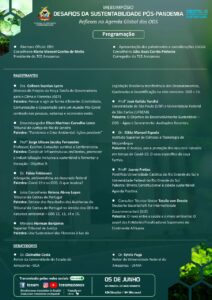 Além de abordar assuntos sobre os desafios da sustentabilidade pós-pandemia do novo coronavírus e seus impactos ao meio ambiente, com o evento, o Tribunal busca, também, discutir e confirmar seu compromisso com a agenda global dos 17 Objetivos de Desenvolvimento Sustentável, tendo em vista as eminentes consequências que a pandemia poderá causar aos mesmos.