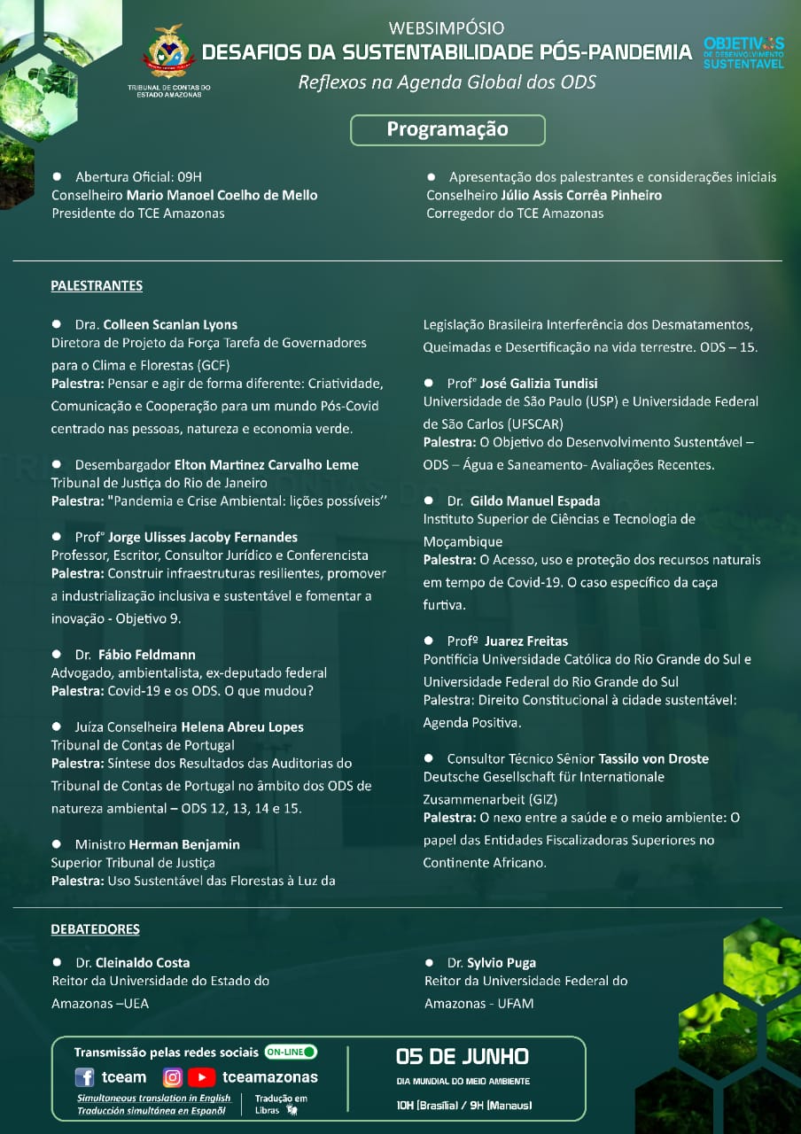 Com a temática “Desafios da Sustentabilidade Pós-Pandemia: Reflexos na Agenda Global da ODS”, a primeira edição do Websimpósio idealizado pelo Tribunal de Contas do Amazonas (TCE-AM) será realizado na próxima sexta-feira (5), a partir das 9h (hora Manaus), com a participação de 14 palestrantes e debatedores nacionais e internacionais.