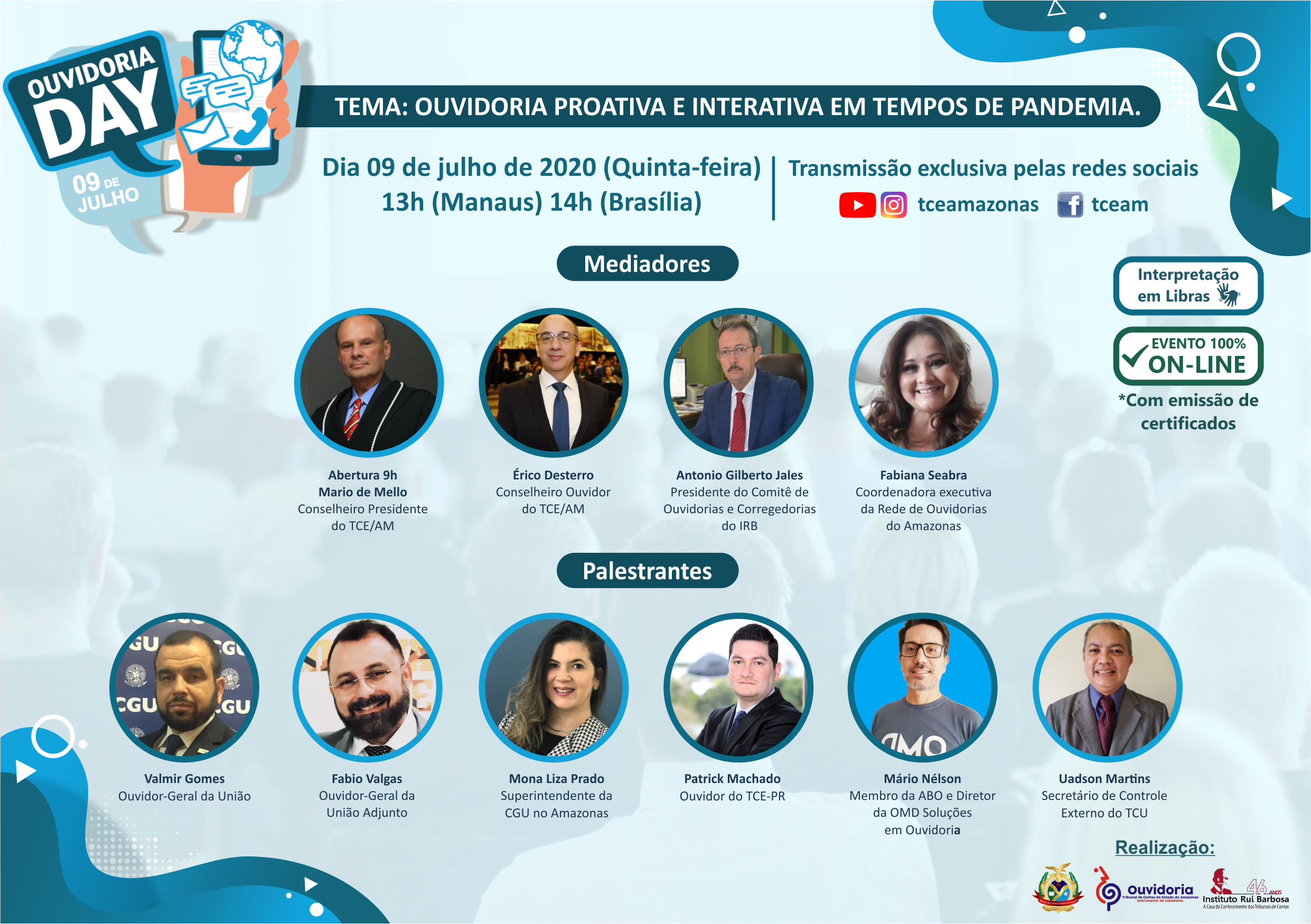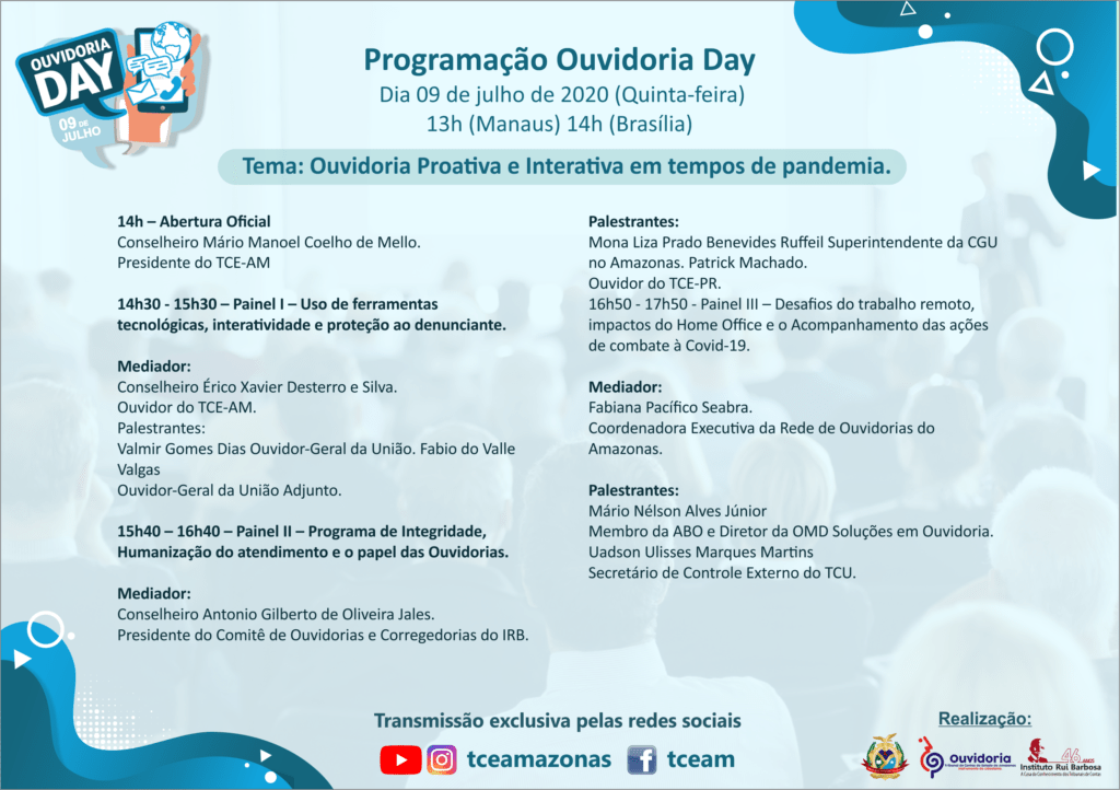 Totalmente virtual e coordenado pela Ouvidoria do TCE-AM, o evento com o tema “Ouvidoria Proativa e Interativa em tempos de pandemia” será transmitido pelas redes sociais do Tribunal (Facebook, Instagram e YouTube), com emissão de certificados aos inscritos.