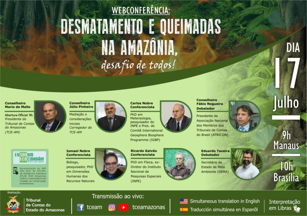Na próxima sexta-feira (17), a partir das 9h (horário de Manaus), o Tribunal de Contas do Amazonas (TCE-AM) promoverá a primeira webconferência para discutir o desmatamento e as queimadas na Amazônia e contará com renomados cientistas ambientais convidados para palestrar e aprimorar o debate.