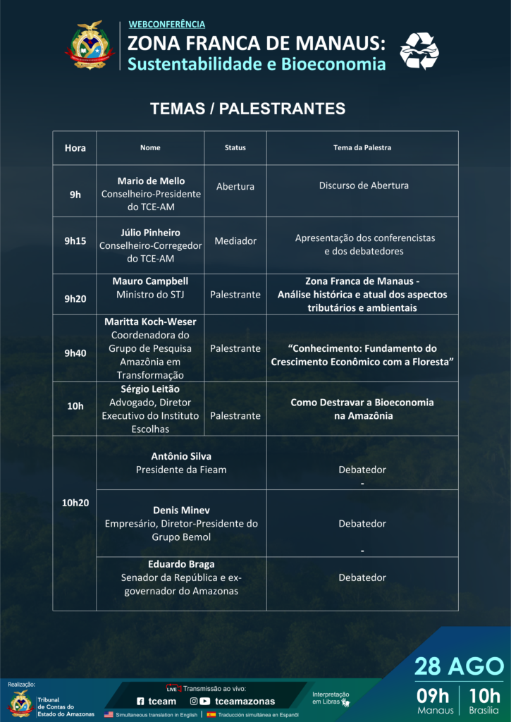 Com a participação de renomados estudiosos em diferentes áreas do desenvolvimento sustentável, o Tribunal de Contas do Amazonas (TCE-AM) promoverá, nesta sexta-feira (28), às 9h (Manaus), a Webconferência “Zona Franca de Manaus: Sustentabilidade e Bioeconomia”. O evento trará diferentes pontos de vista sobre as questões econômicas que cercam a Zona Franca, além dos impactos ambientais causados por ela.Em decorrência da iminente votação do Congresso Nacional pela nova Reforma Tributária, fator que deve impactar diretamente à existência da Zona Franca de Manaus e as formas nas quais ela é gerida, a gestão do TCE-AM, presidido pelo conselheiro Mario de Mello, vislumbrou a necessidade de aumentar as discussões no âmbito estadual acerca desta temática. Para isso, em conjunto com o conselheiro Júlio Pinheiro, um dos organizadores do evento e responsável pelas questões ambientais envolvidas com a Corte de Contas, o Tribunal convidou nomes respeitados a níveis nacional e internacional para debater a respeito.