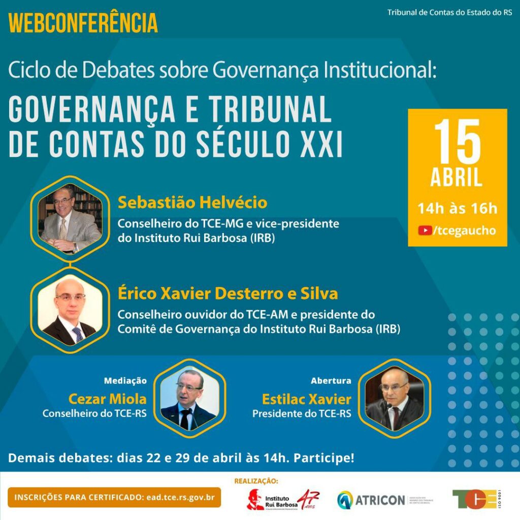 A webconferência contará com um debate acerca da Governança Institucional entre o conselheiro Érico Desterro, que é também presidente do Comitê de Governança do Instituto Rui Barbosa (IRB), e o conselheiro do TCE de Minas Gerais e vice-presidente do IRB, Sebastião Helvécio. As conversas serão mediadas pelo conselheiro Cezar Miola, do TCE-RS.