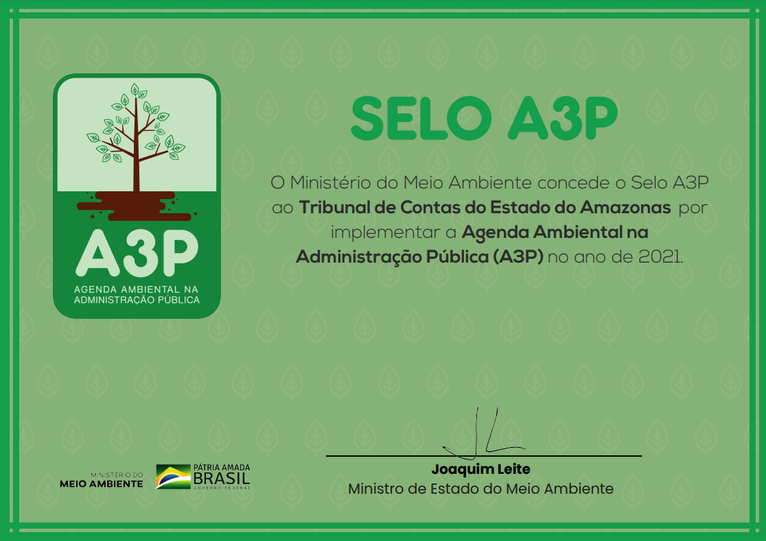 De forma inédita e em reconhecimento aos trabalhos realizados no campo ambiental e de sustentabilidade durante o ano de 2021, o Tribunal de Contas do Amazonas (TCE-AM) recebeu, o Selo Verde de Monitoramento da Agenda A3P, programa do Ministério do Meio Ambiente que estimula instituições públicas do país a implementarem práticas de sustentabilidade. O anúncio da premiação foi feito durante a 14ª Sessão Ordinária do Tribunal Pleno, na manhã desta segunda-feira (25), pelo conselheiro-presidente Érico Desterro.