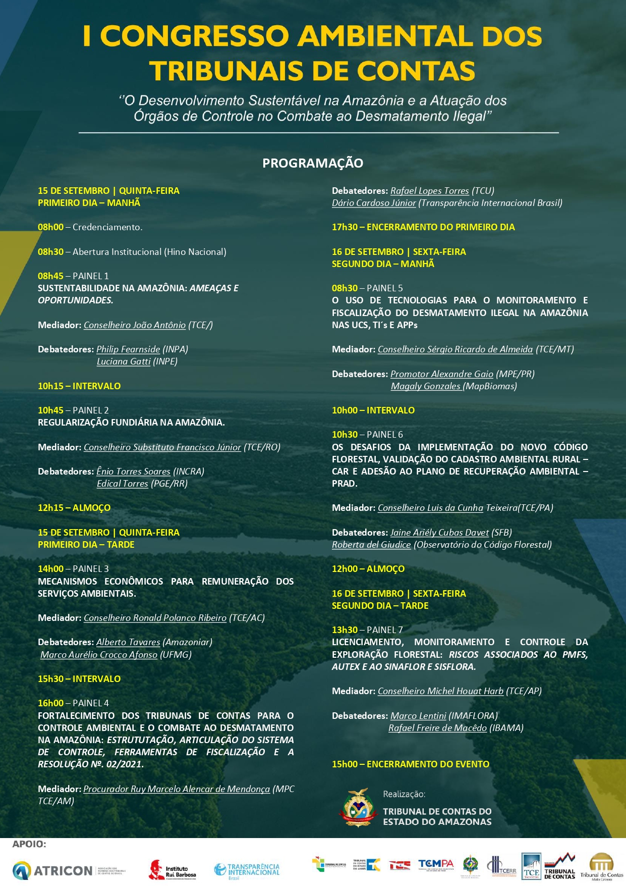 O evento tem apoio da Associação dos Tribunais de Contas (Atricon), do Instituto Rui Barbosa (IRB), e dos Tribunais de Contas do Acre, Amapá, do Estado e Municípios do Pará, Rondônia, Roraima, Tocantins, Maranhão e Mato Grosso.
