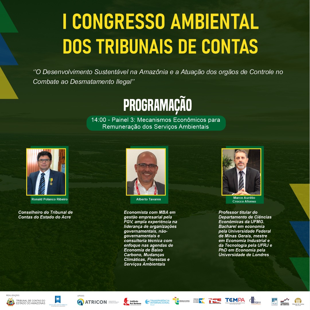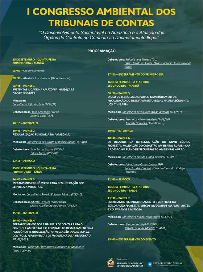 Ainda haverá debates sobre os mecanismos econômicos para remuneração dos serviços ambientais, com Alberto Tavares, do Amazoniar, e Marco Aurélio Crocco Afonso, da Universidade Federal de Minas Gerais (UFMG); o fortalecimento dos Tribunais para o controle ambiental, com Rafael Lopes Torres, do TCU, e Dário Cardoso Júnior, do Transparência Internacional Brasil.