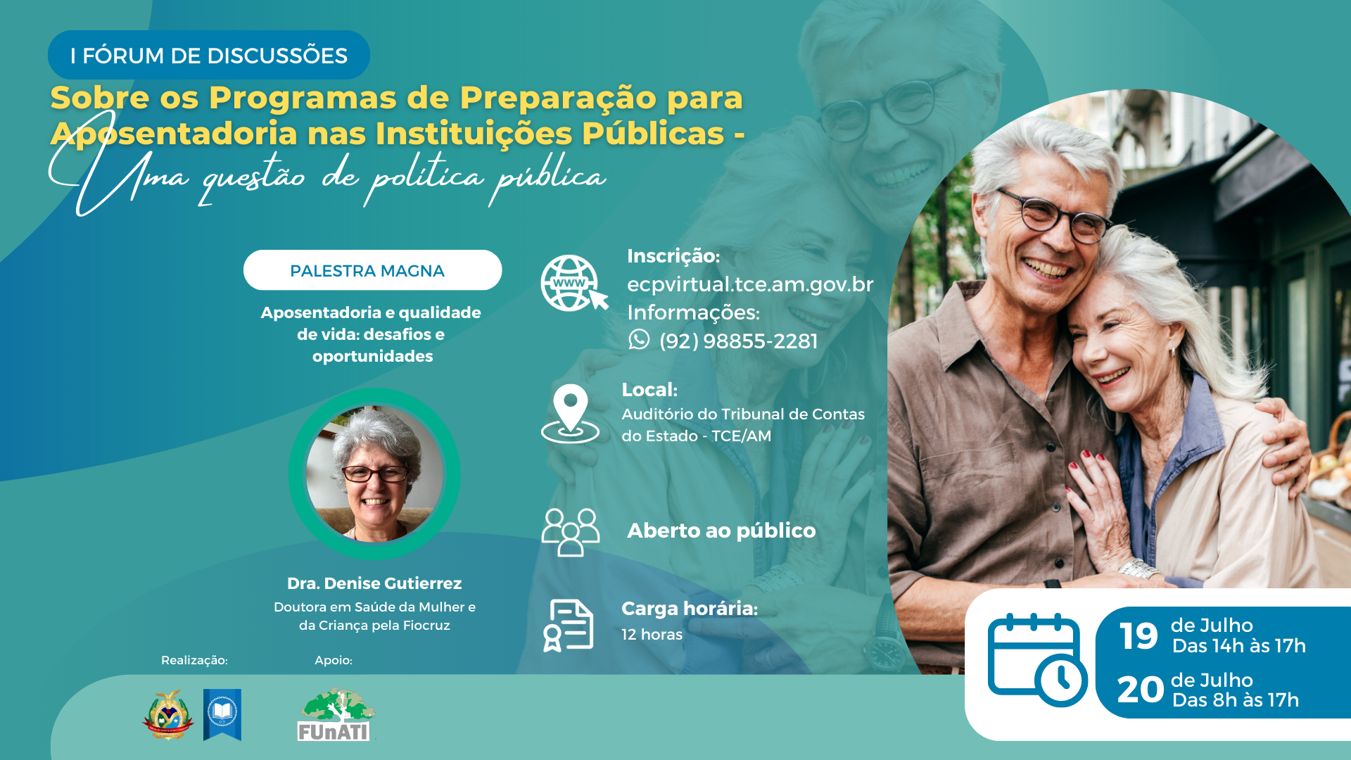 Para estimular o debate sobre a importância de um planejamento prévio do poder público ao momento de aposentadoria dos servidores públicos, o Tribunal de Contas do Amazonas (TCE-AM) realiza, das 14h às 17h do dia 19, e das 8h às 17h do dia 20 de julho, o 1º Fórum de Discussões sobre Programas de Preparação para a Aposentadoria.