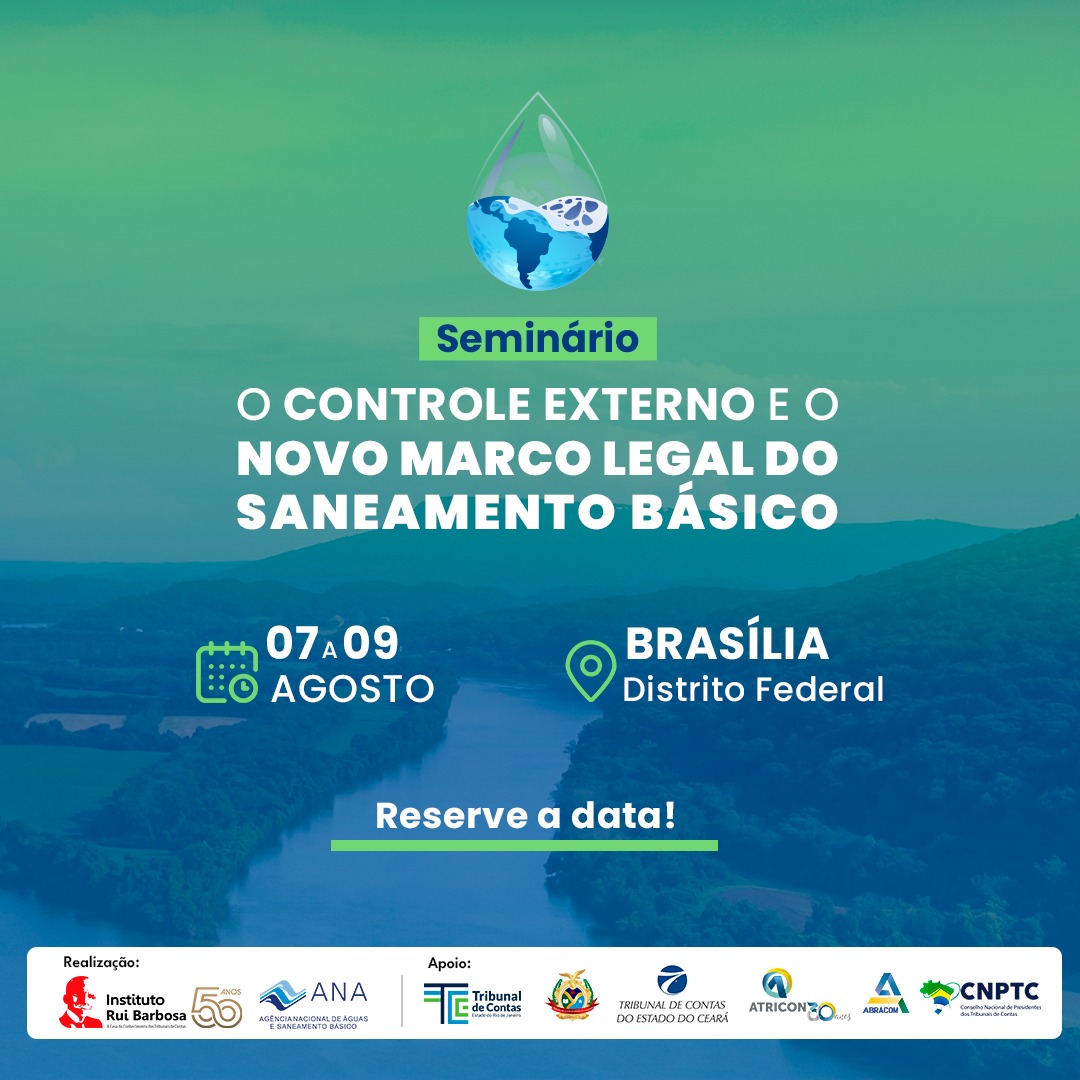 No período de 07 a 09 de agosto deste ano, no Auditório do Edifício ION, sede do Instituto Rui Barbosa (IRB), em Brasília-DF, será realizado o seminário “O Controle Externo e o Novo Marco Legal do Saneamento Básico”.