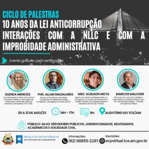 Durante os dias 29, 30 e 31 de agosto, o Tribunal de Contas do Amazonas (TCE-AM), via Escola de Contas Públicas (ECP), realizará um ciclo de palestra para celebrar os 10 anos da Lei Anticorrupção, com interações voltadas para a Nova Lei de Licitações e Contratos (NLLC) e Improbidade Administrativa.