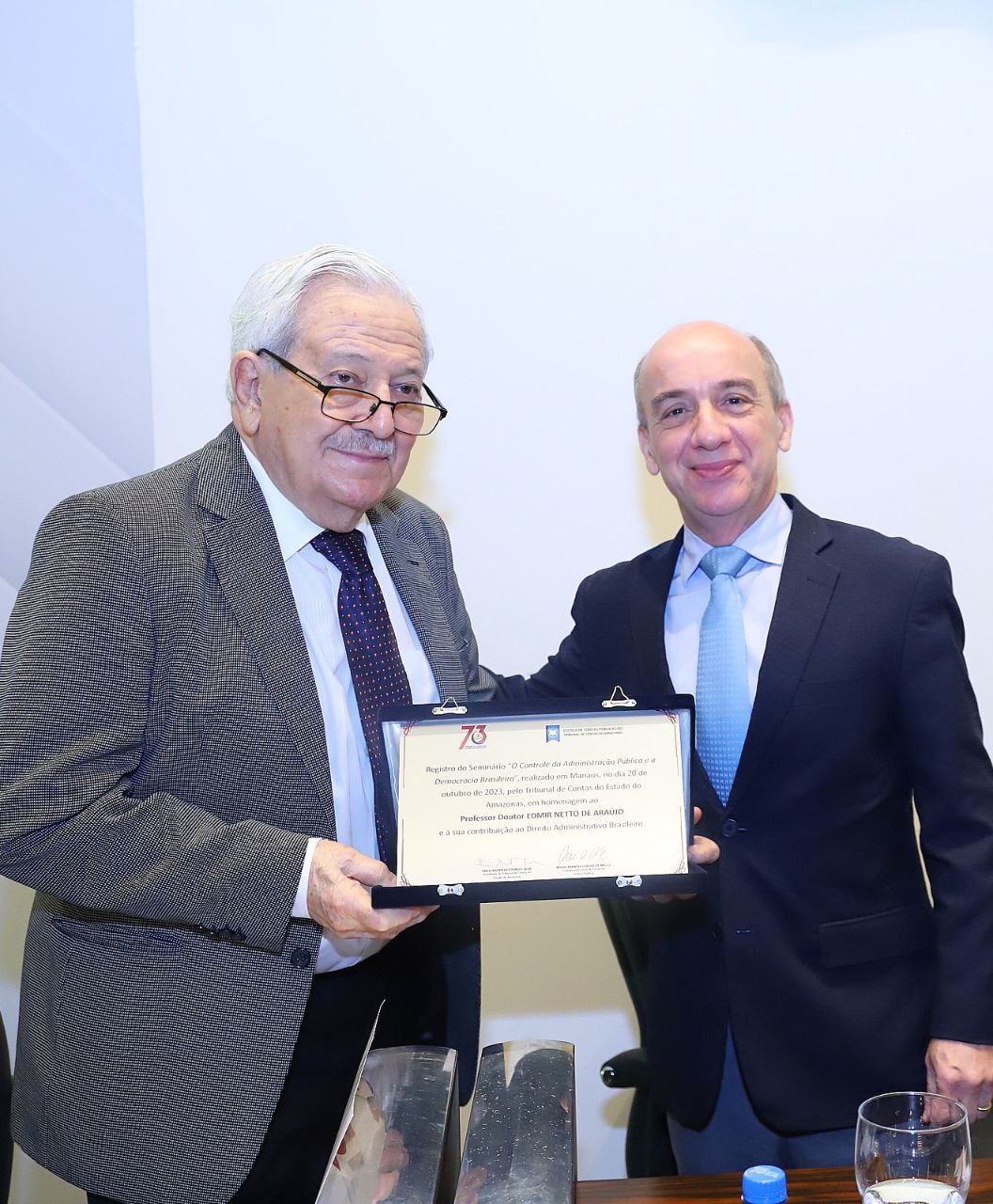 “Tenho a honra de dizer que pude ser professor e dizer que muitos que hoje se fazem presente neste evento eu pude aprender com a troca entre aluno e professor. Reverencio aqui o repertório do Tribunal de Contas do Estado do Amazonas e deixo meu agradecimento pelas palavras e reconhecimento de todos” disse o homenageado, Prof. Dr. Edmir Netto de Araújo.