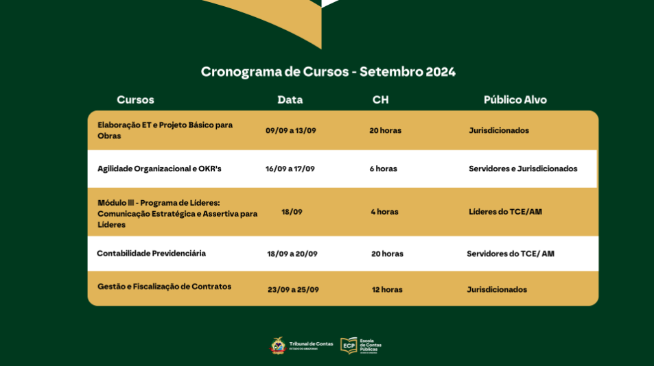 A Escola de Contas Públicas do Tribunal de Contas do Amazonas (ECP/TCE-AM) divulgou nesta quarta-feira (11) o cronograma de cursos para setembro. As capacitações são voltadas para o aperfeiçoamento de servidores e jurisdicionados, e serão realizadas presencialmente na ECP.