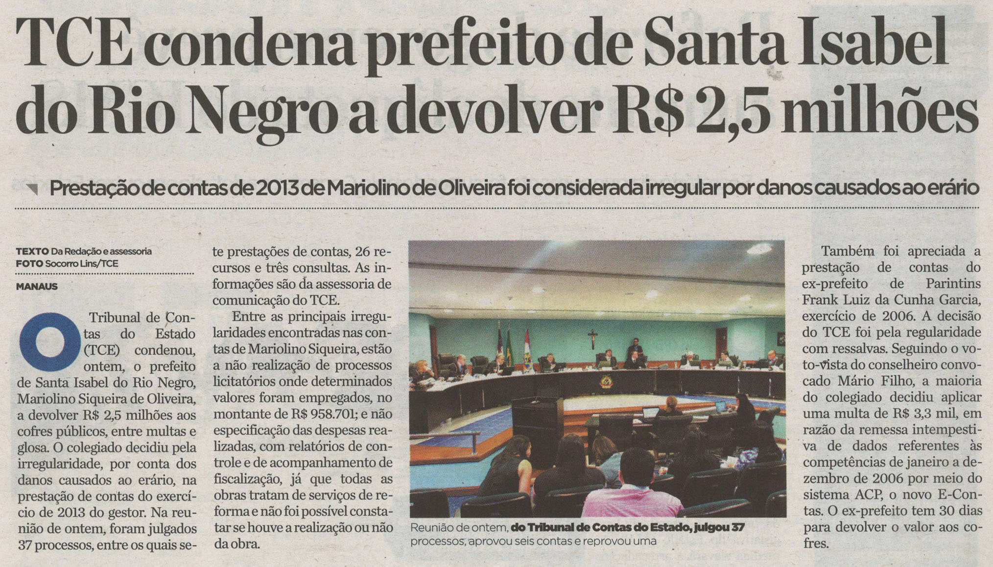 1°/10/15 Diário do Amazonas TCE condena prefeito de Santa Isabel do Rio Negro a devolver R$ 2,5 milhões