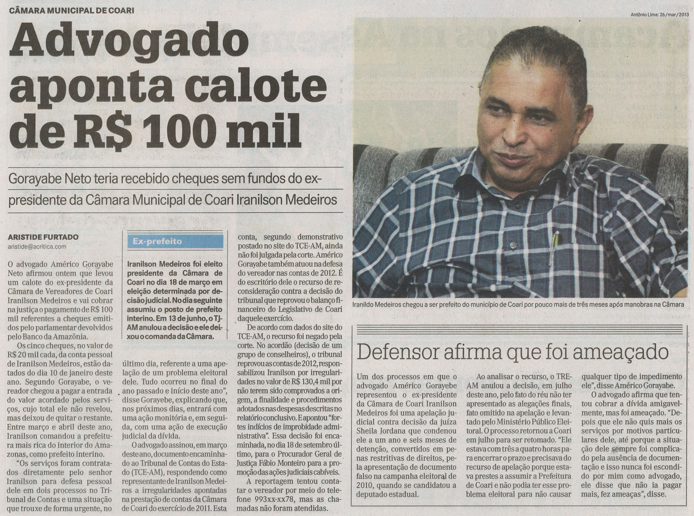 15/10/15 A Crítica Advogado aponta calote de R$ 100mil