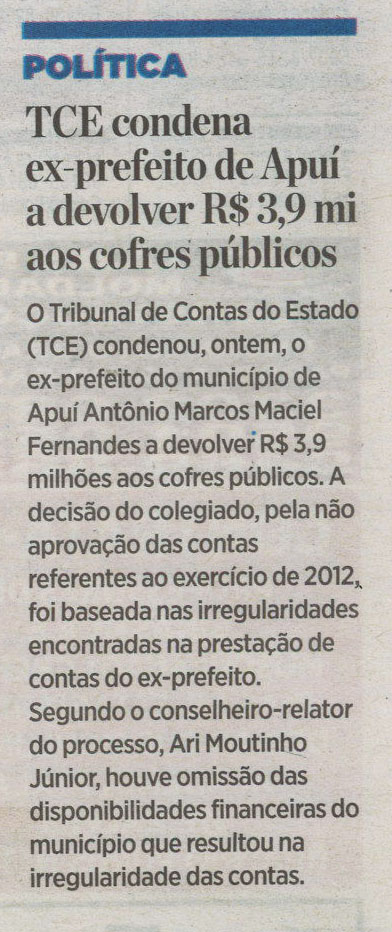22/10/15 Diário do Amazonas TCE condena ex-prefeito de Apuí a devolver R$ 3,9 mi aos cofres públicos
