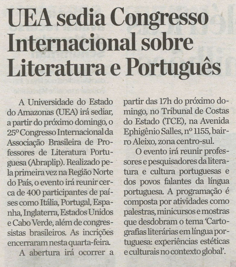 5/11/15 Diário do Amazonas UEA sedia Congresso Internacional sobre Literaura e Português