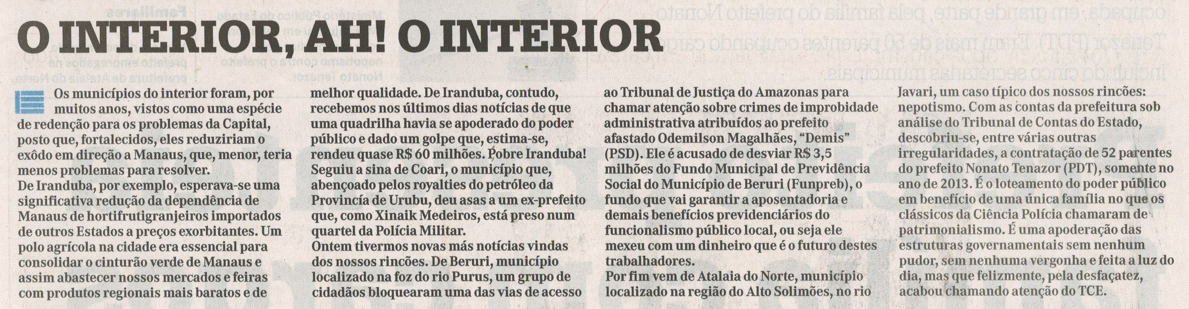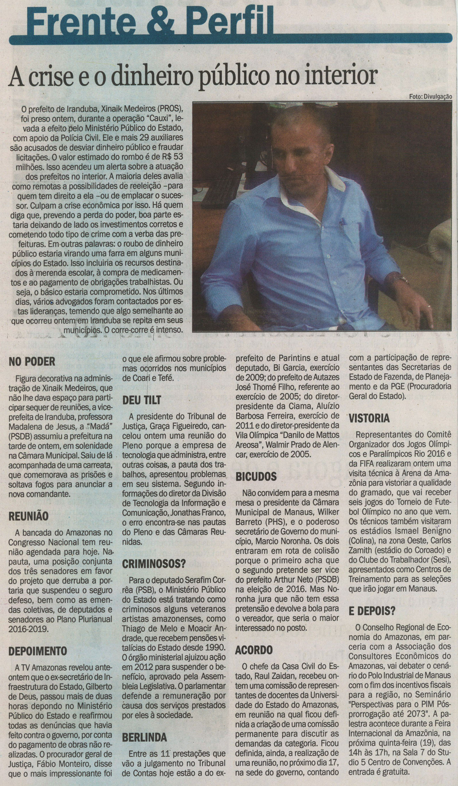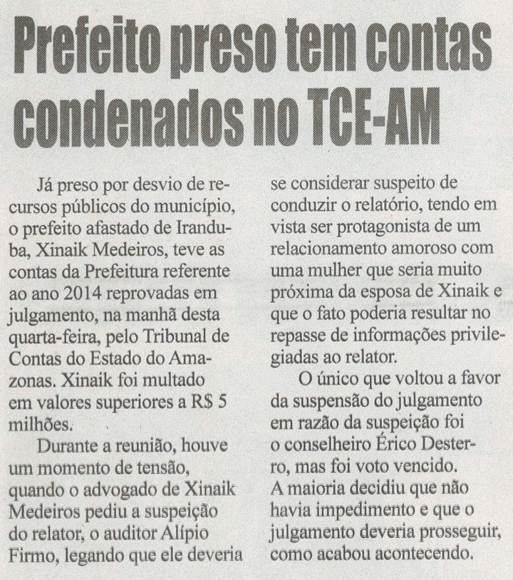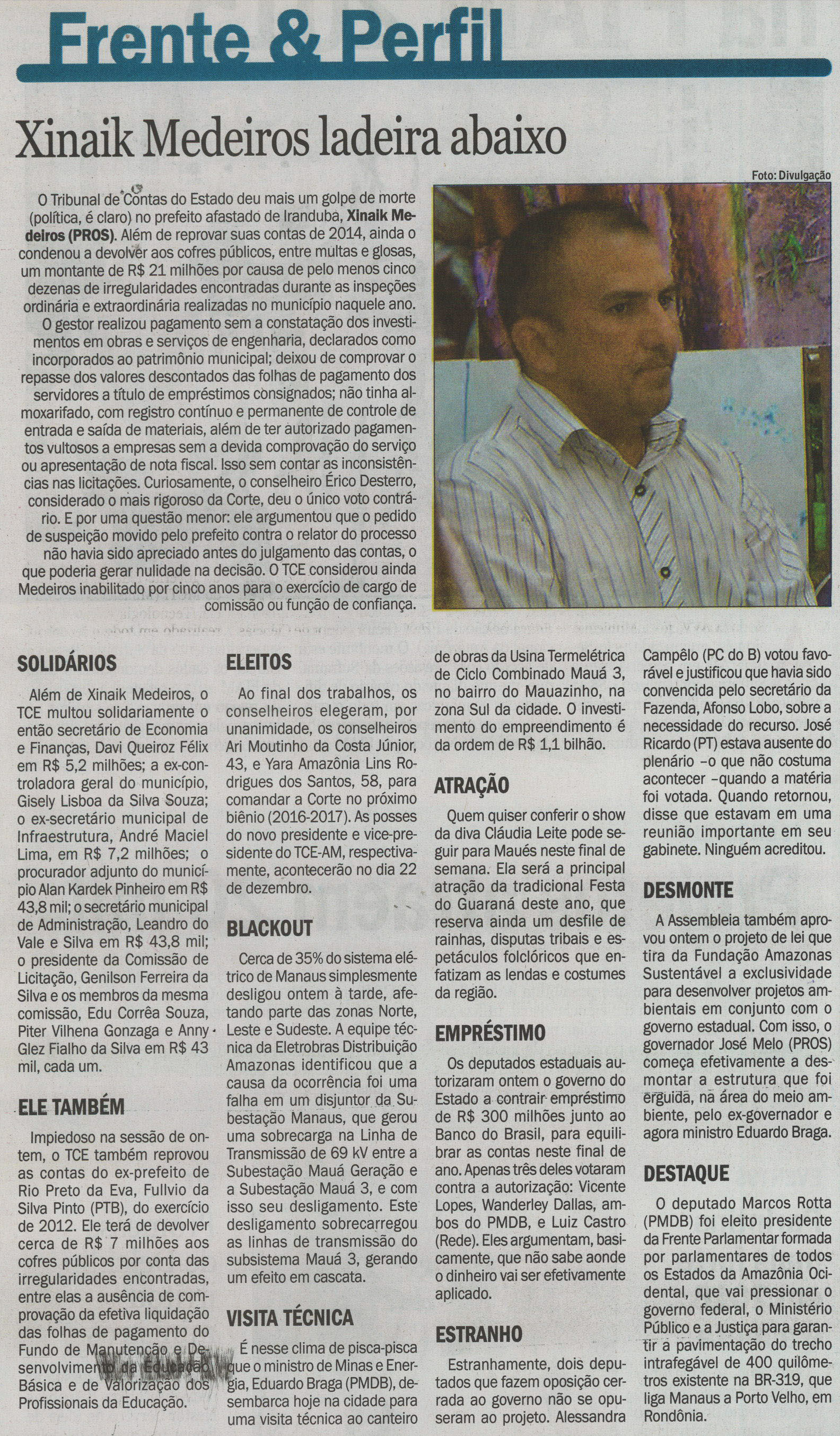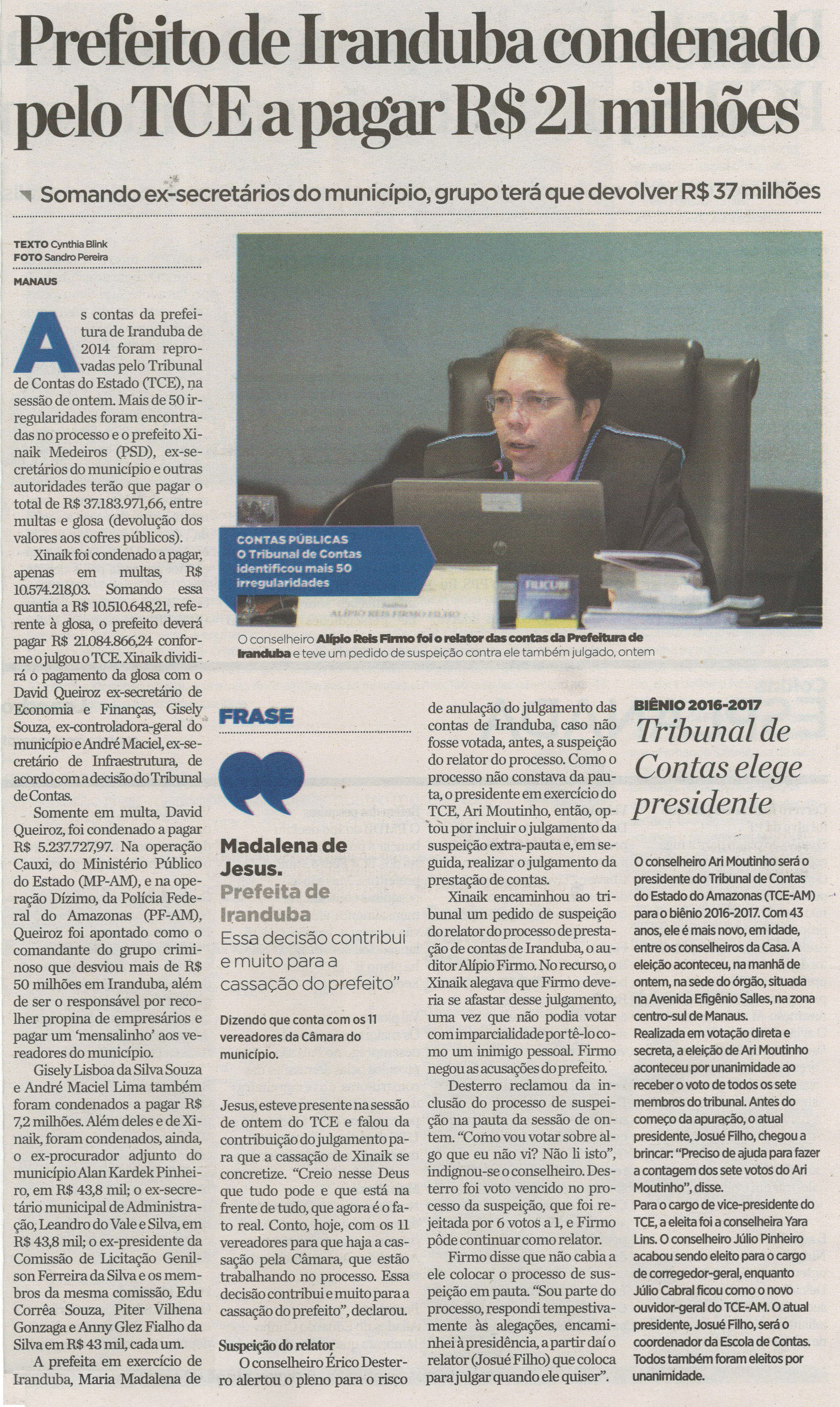 26/11/15 Diário do Amazonas Prefeito de Iranduba condenado pelo TCE a pagar R$ 21 milhões