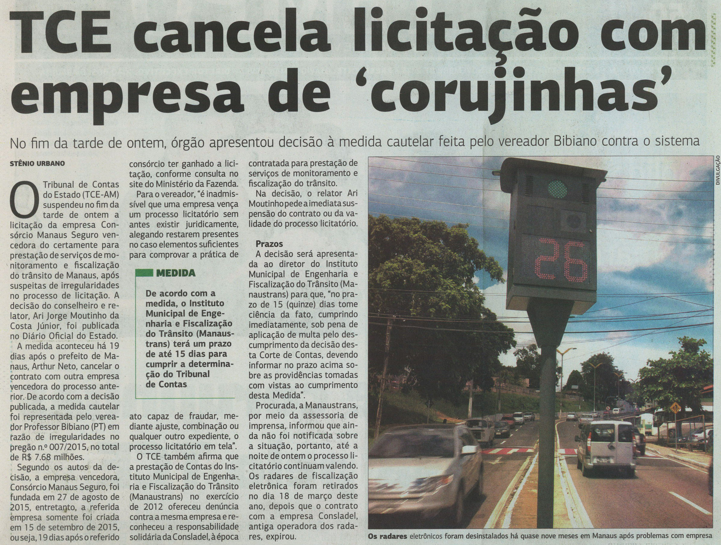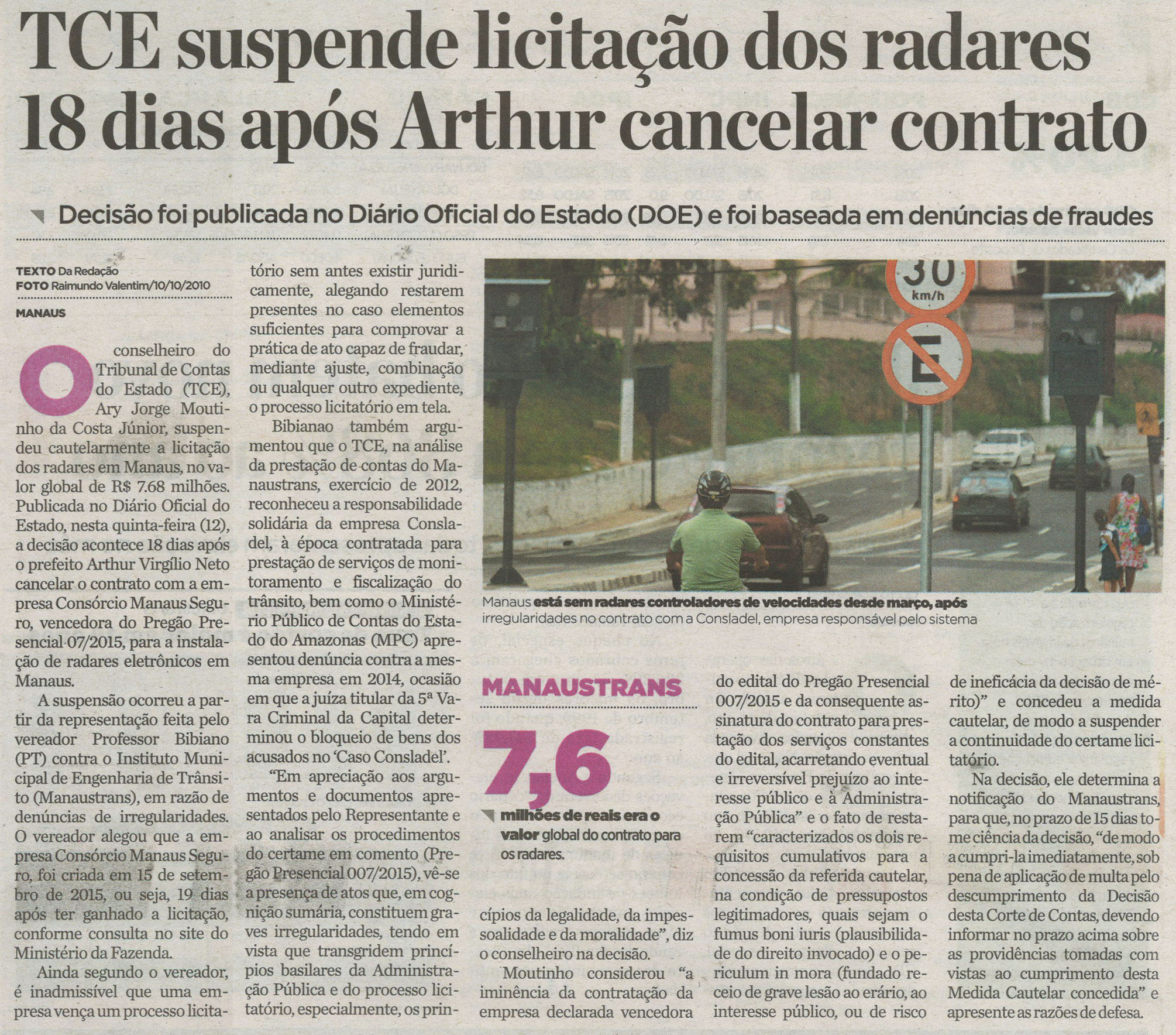13/11/15 Diário do Amazonas TCE suspende licitação dos radares 18 dias após Arthur cancelar contrato