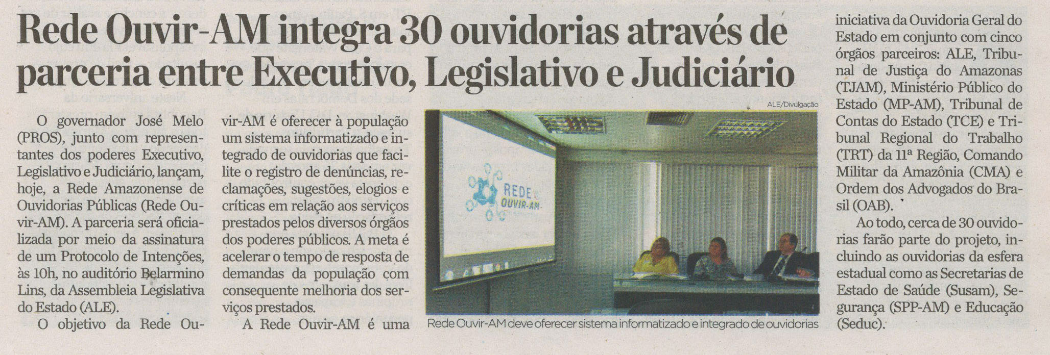 16/11/15 Diário do Amazonas Rede Ouvir-AM integra 30 ouvidorias através de parceria entre Executivo, Legislativo e Judiciário