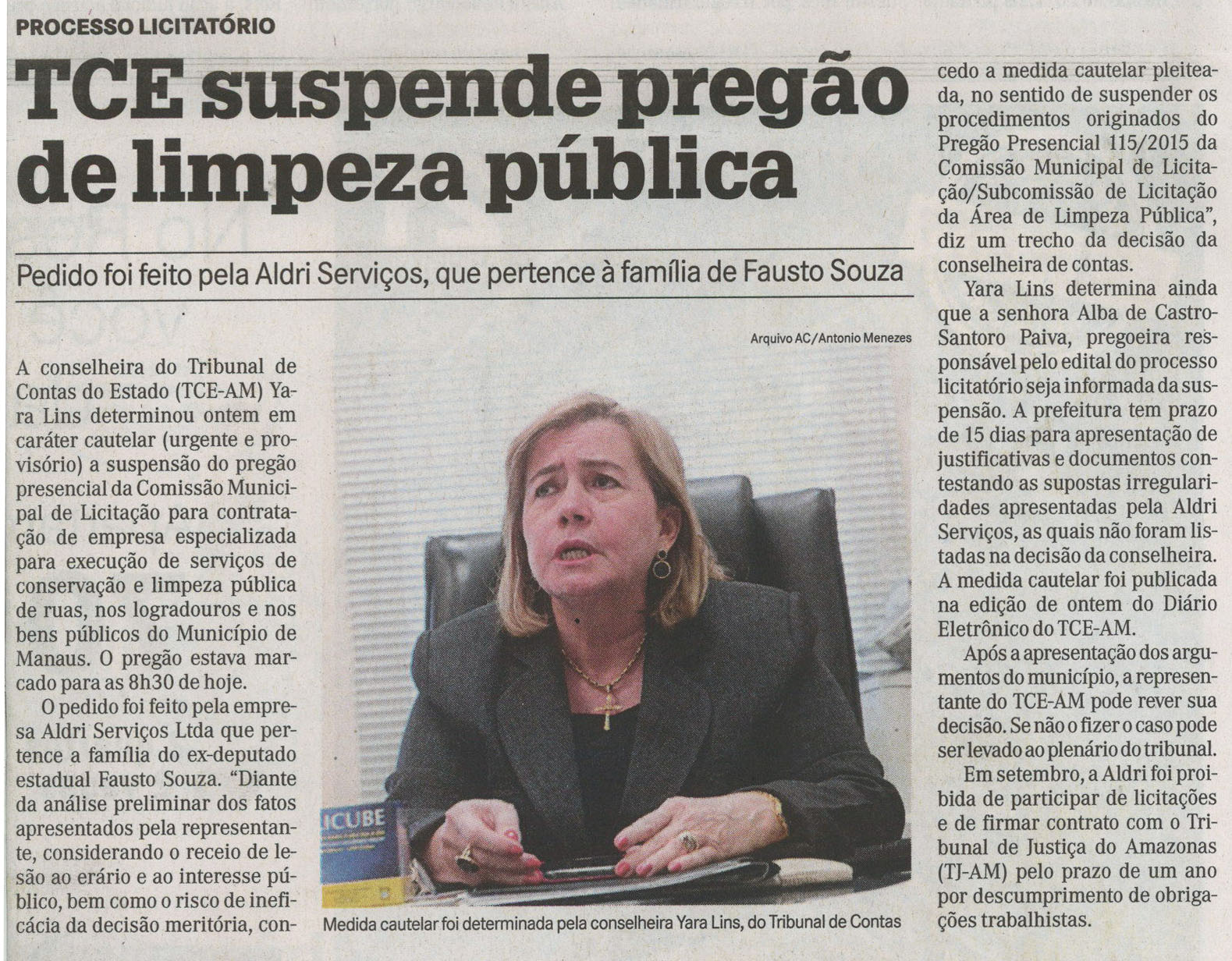 25/11/15 A Crítica TCE suspende pregão de limpeza pública