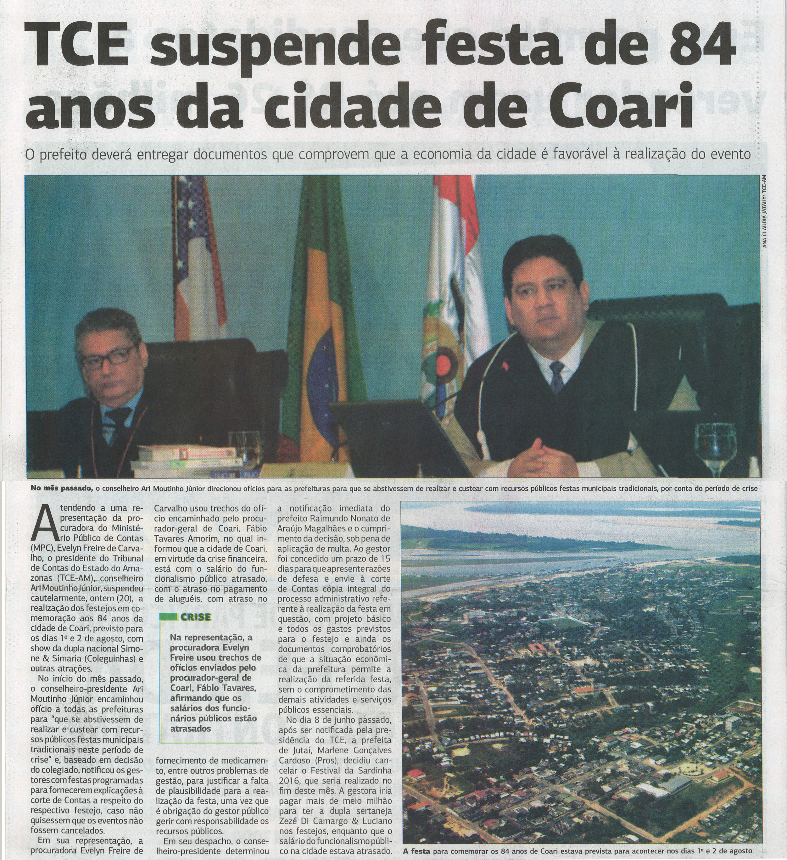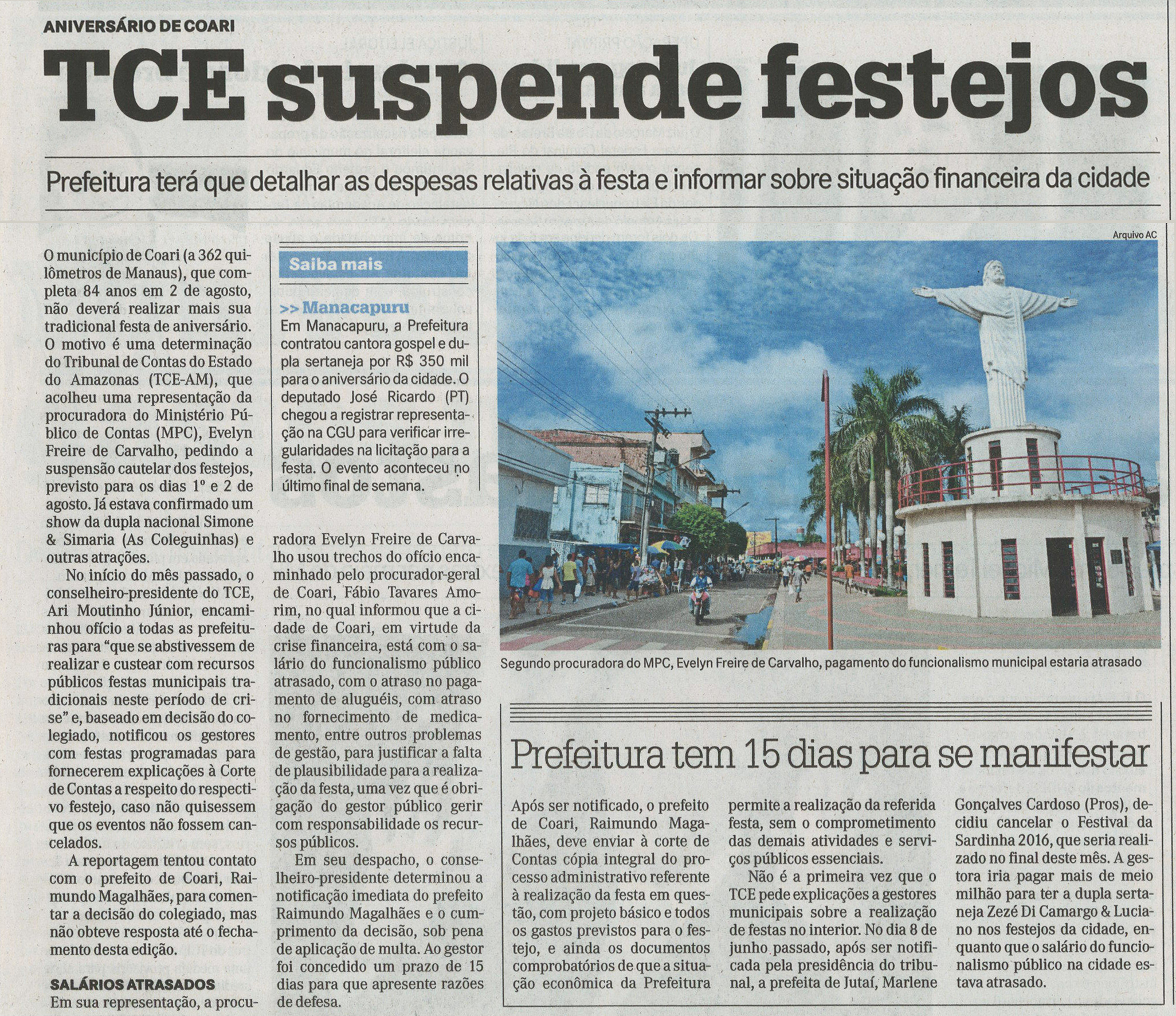 TCE suspende festa 84 anos da cidade de Coari