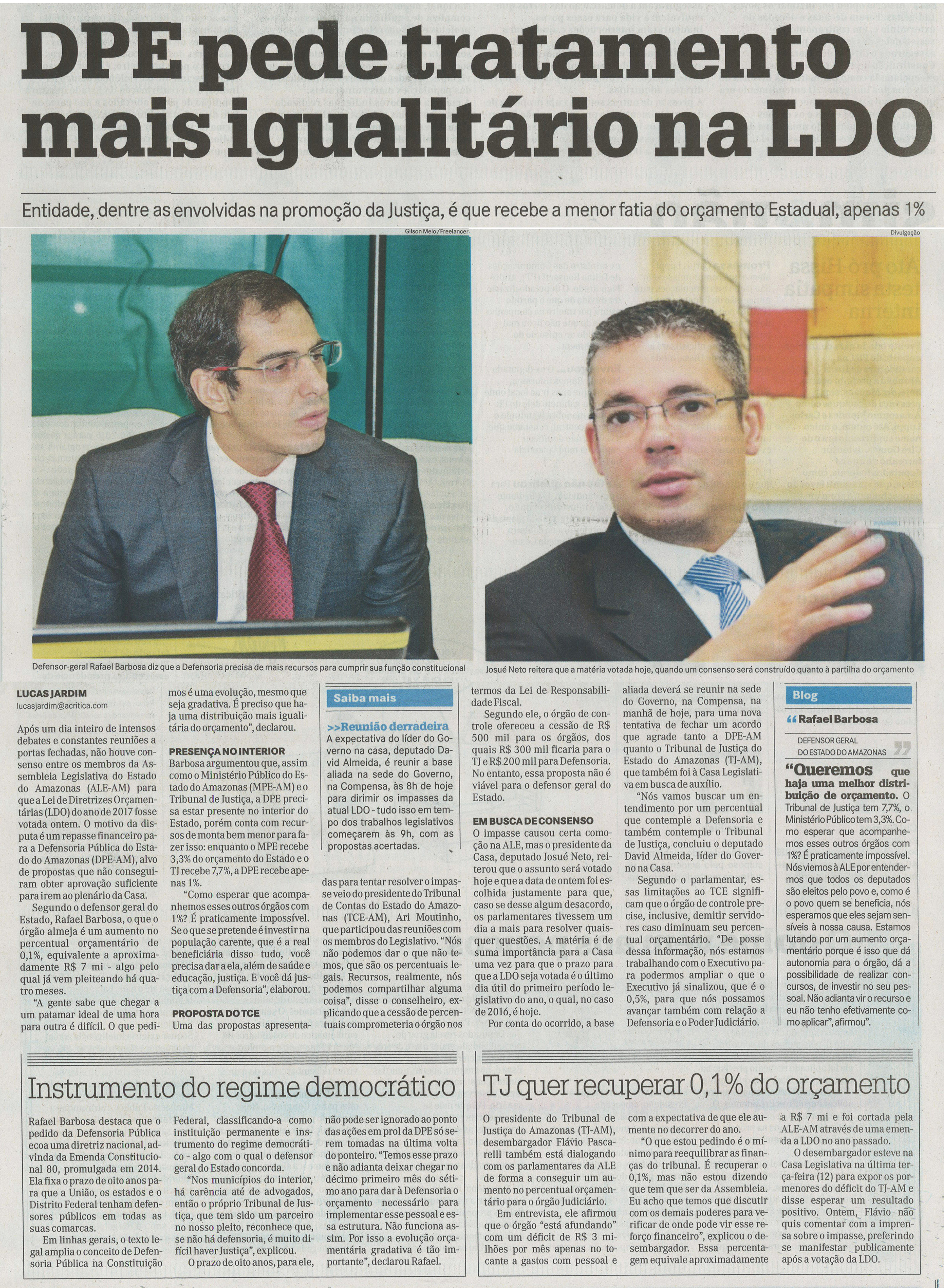 DPE pede tratamento mais igualitário na LDO