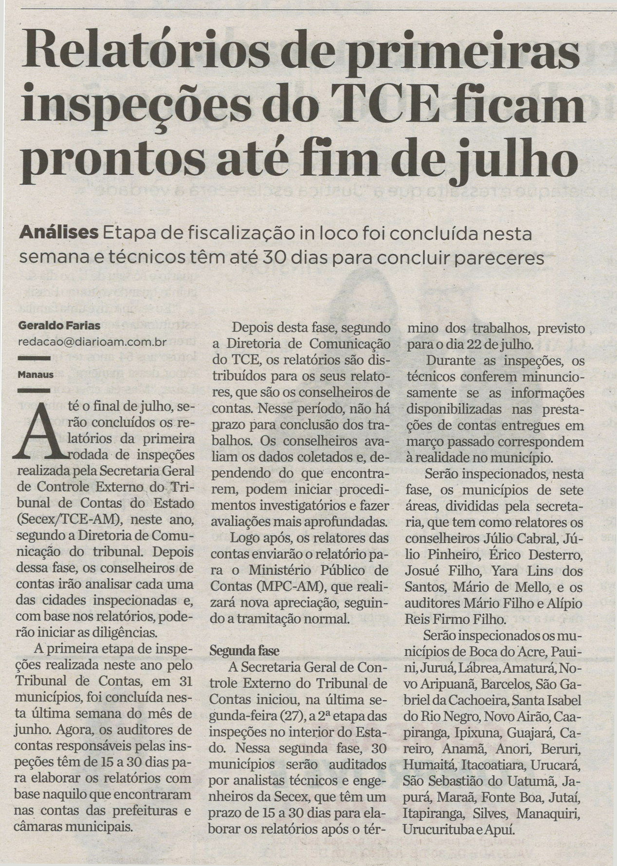 Relatórios de primeira inspeções do TCE ficam pronto até fim de julho