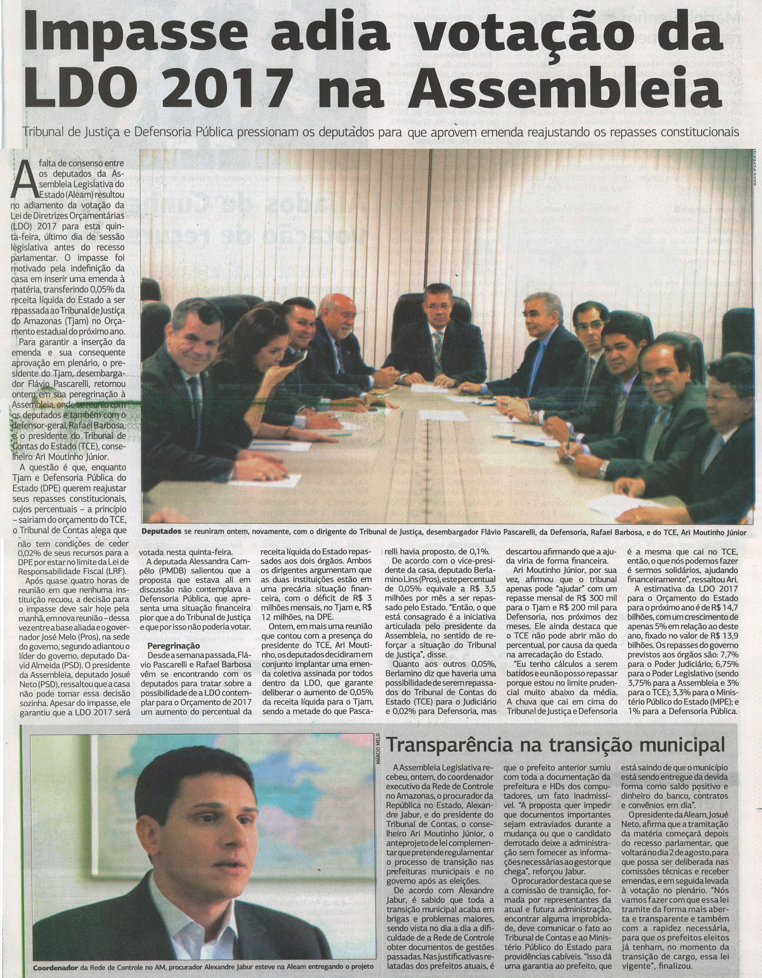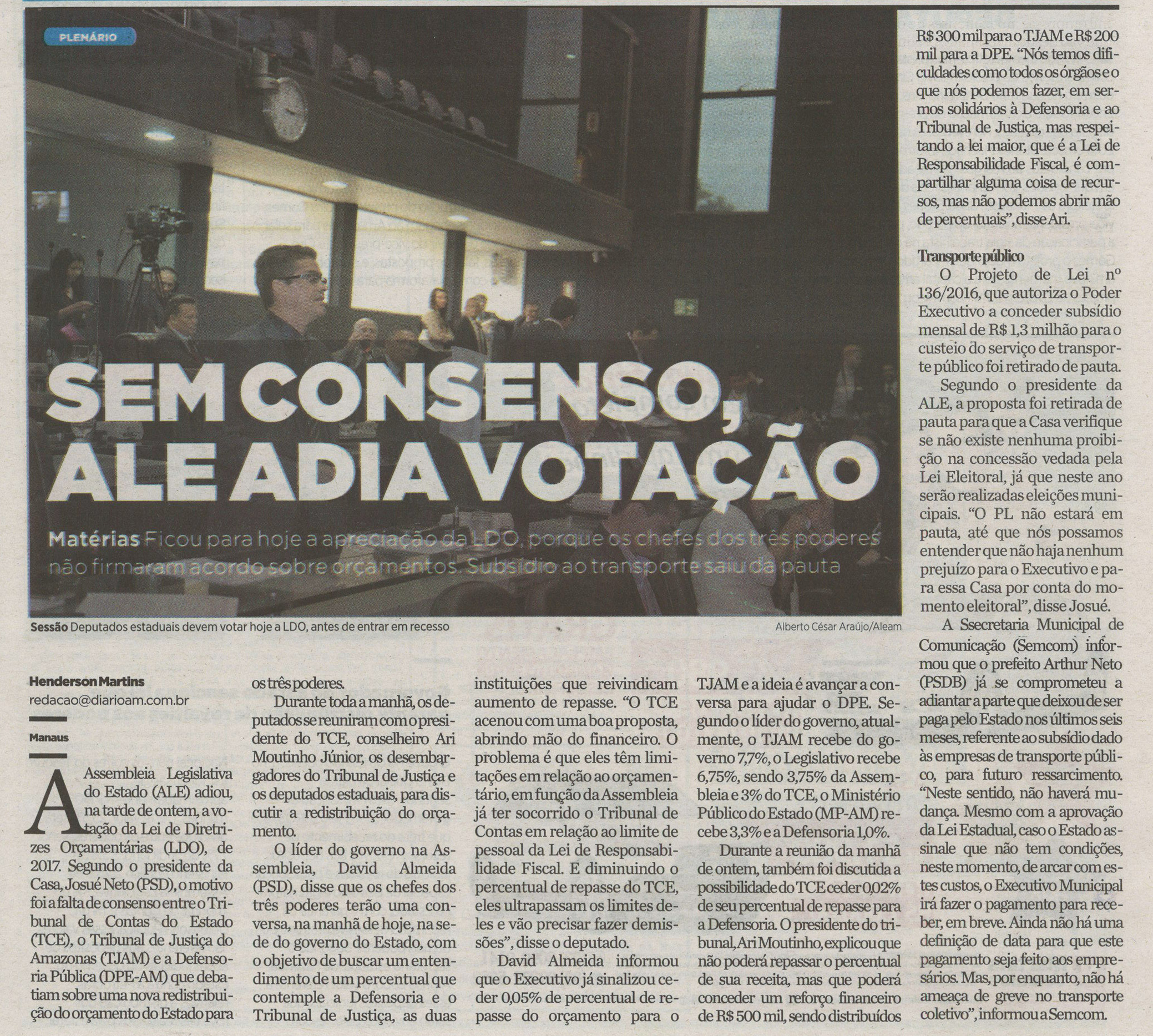 Impasse adia votação da LDO 2017 na Assembleia