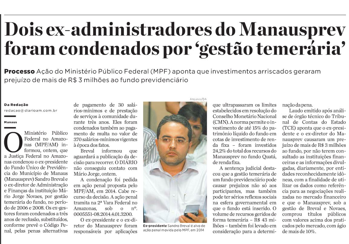Dois ex-administradores do Manausprev foram condenados por 'gestão temerária'