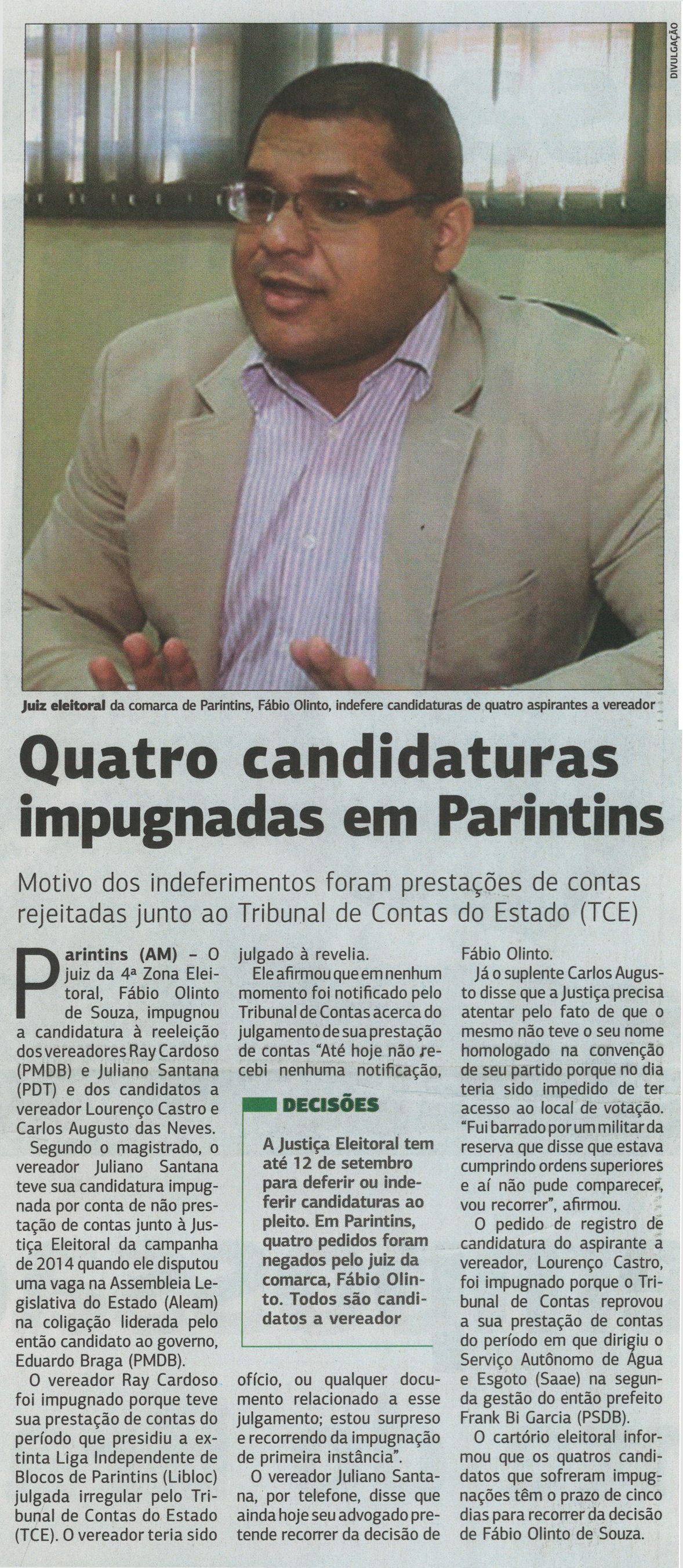 01/09/16 Em Tempo Quatro candidaturas impugnadas em Parintins