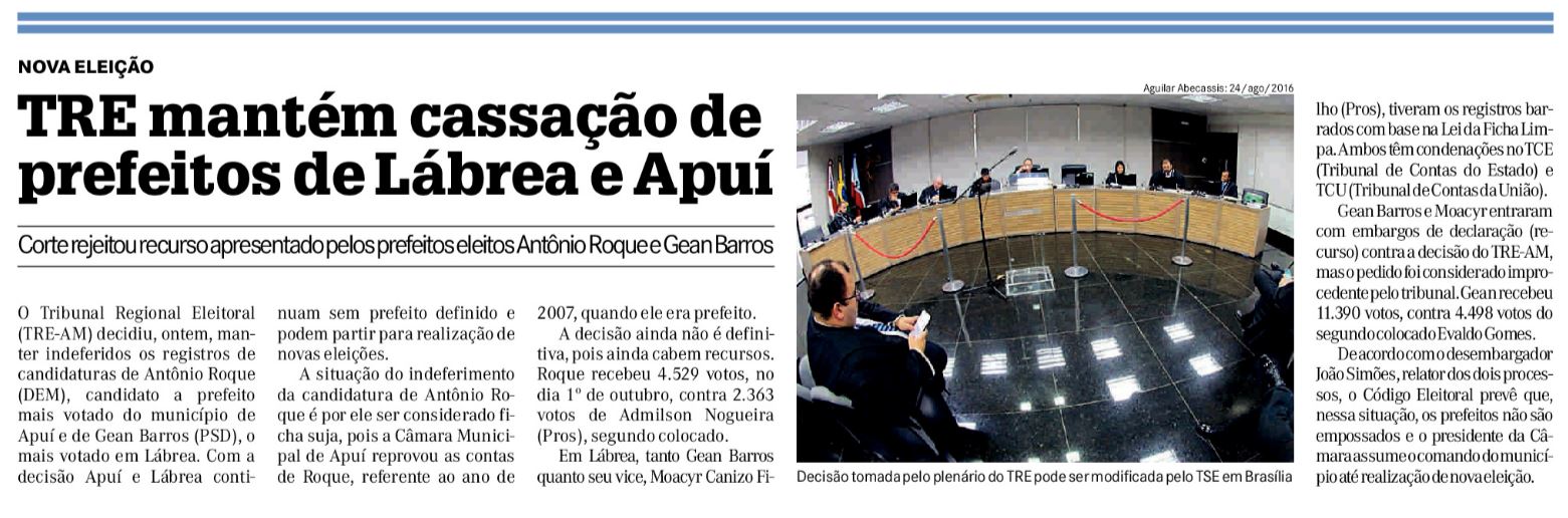 26/11/16 A Crítica TRE mantém cassação de prefeitos de Lábrea e Apuí