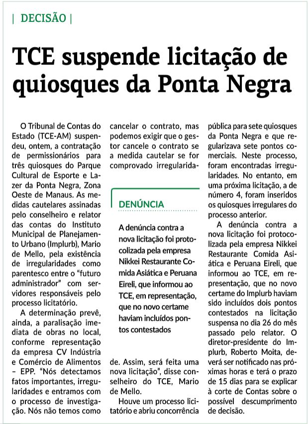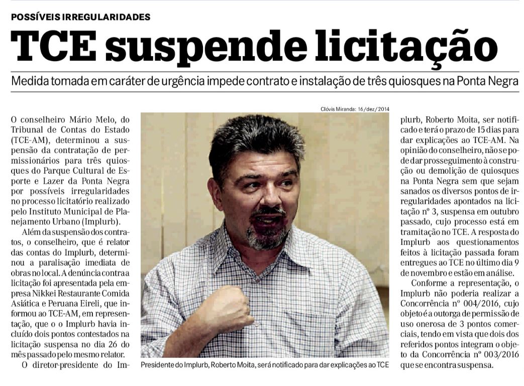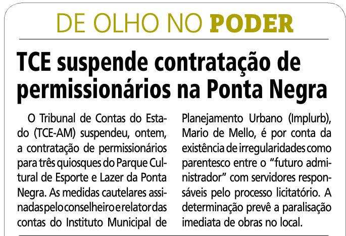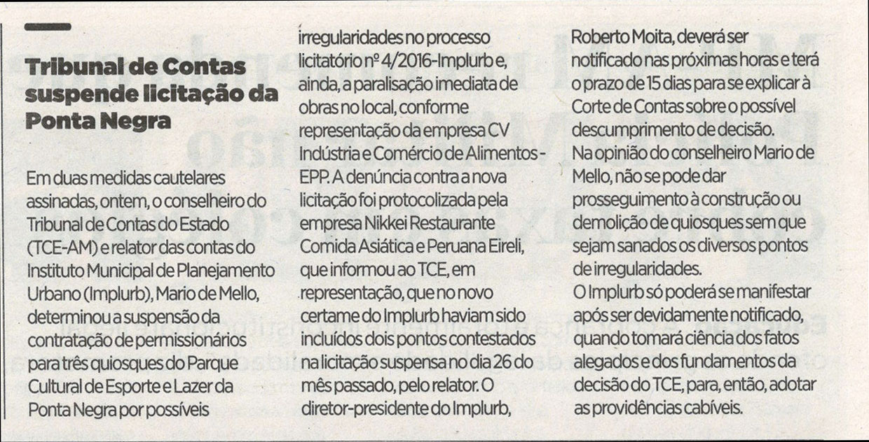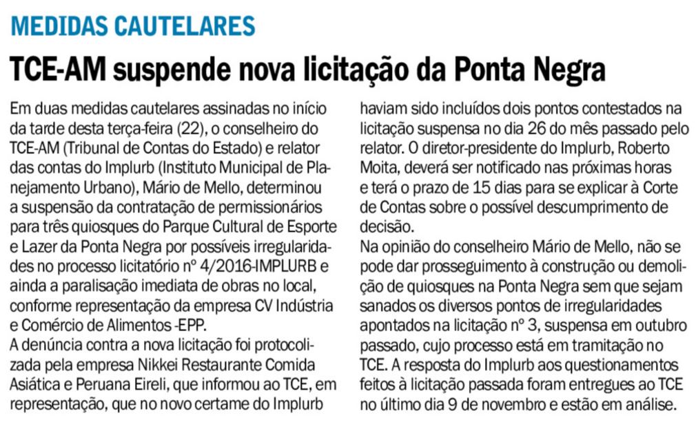 23/11/16 Diário do Amazonas Tribunal de Contas suspende licitação da Ponta Negra