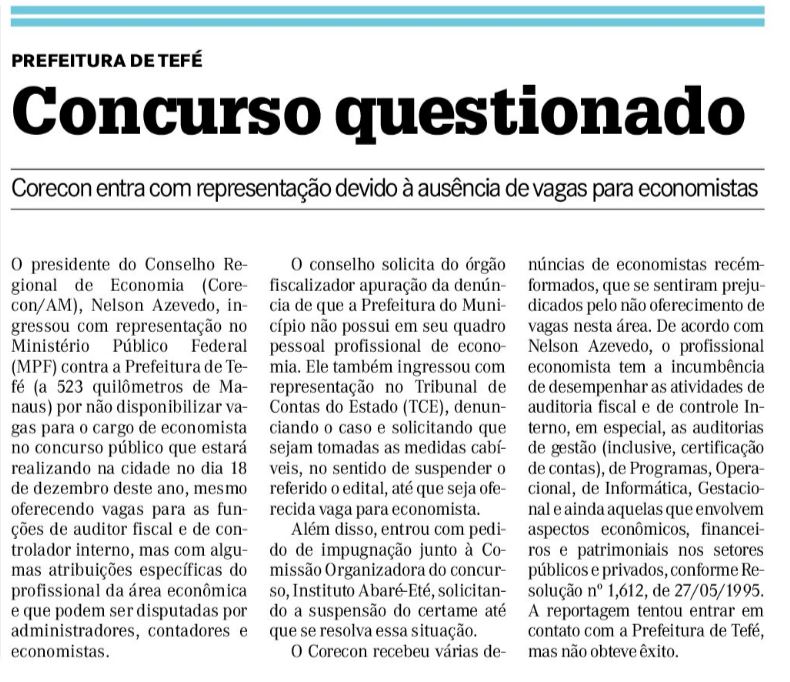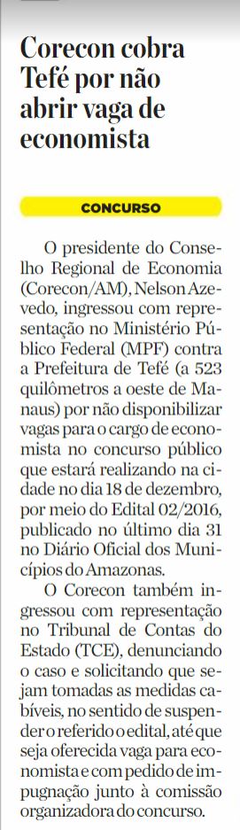 09/11/16 Diário do Amazonas Corecon cobra Tefé por não abrir vaga de economista