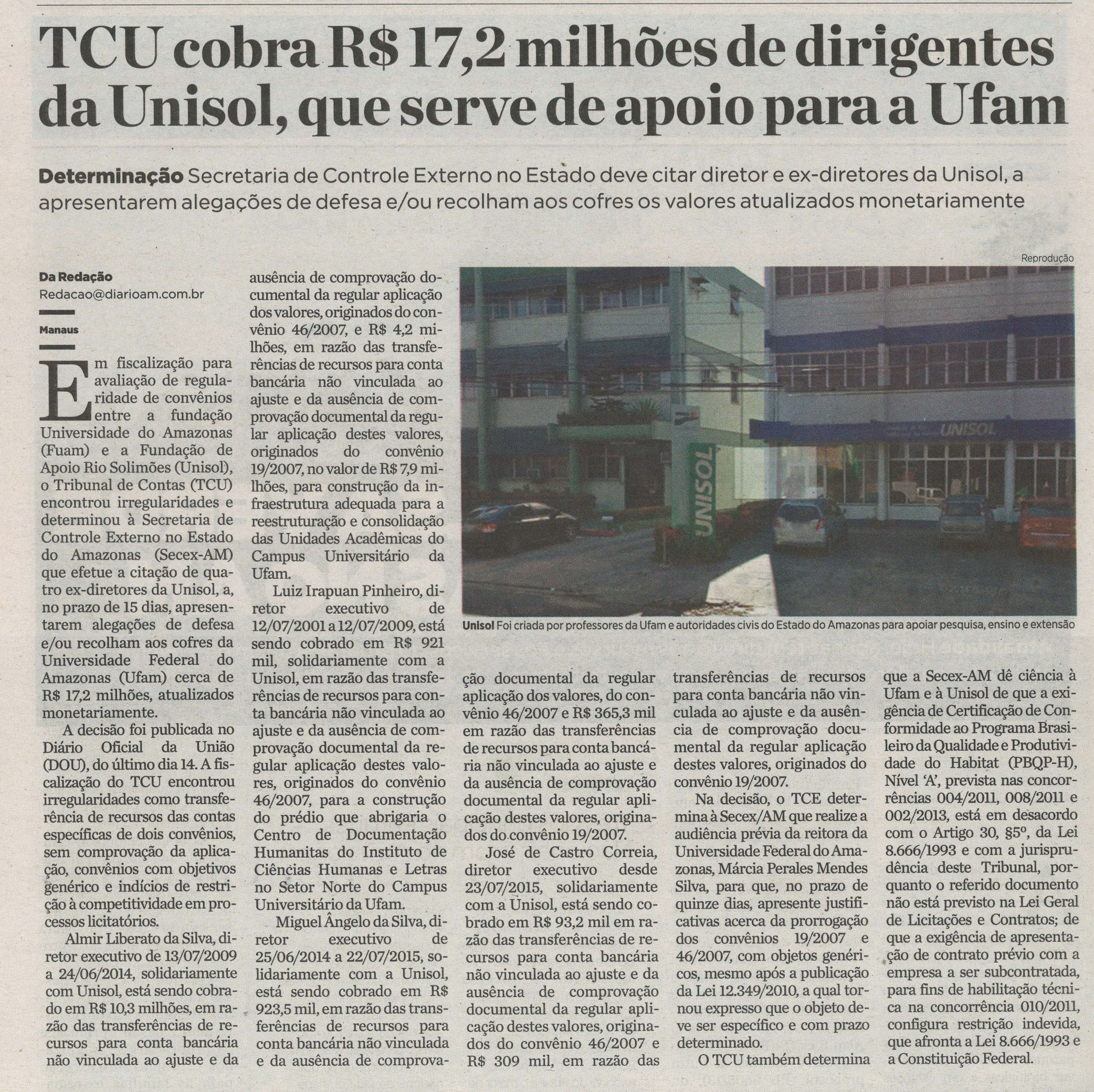 16/11/16 Diário do Amazonas TCE cobra R$ 17,2 milhões de dirigentes da Unisol, que serve de apoio para a Ufam