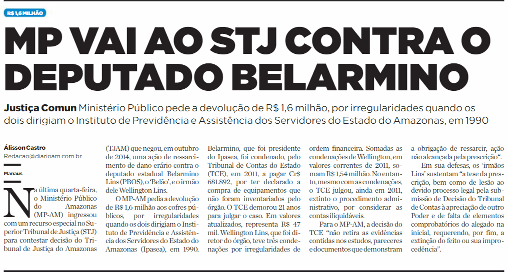 21/11/16 Diário do Amazonas MP vai ao STJ contra o deputado Belarmino