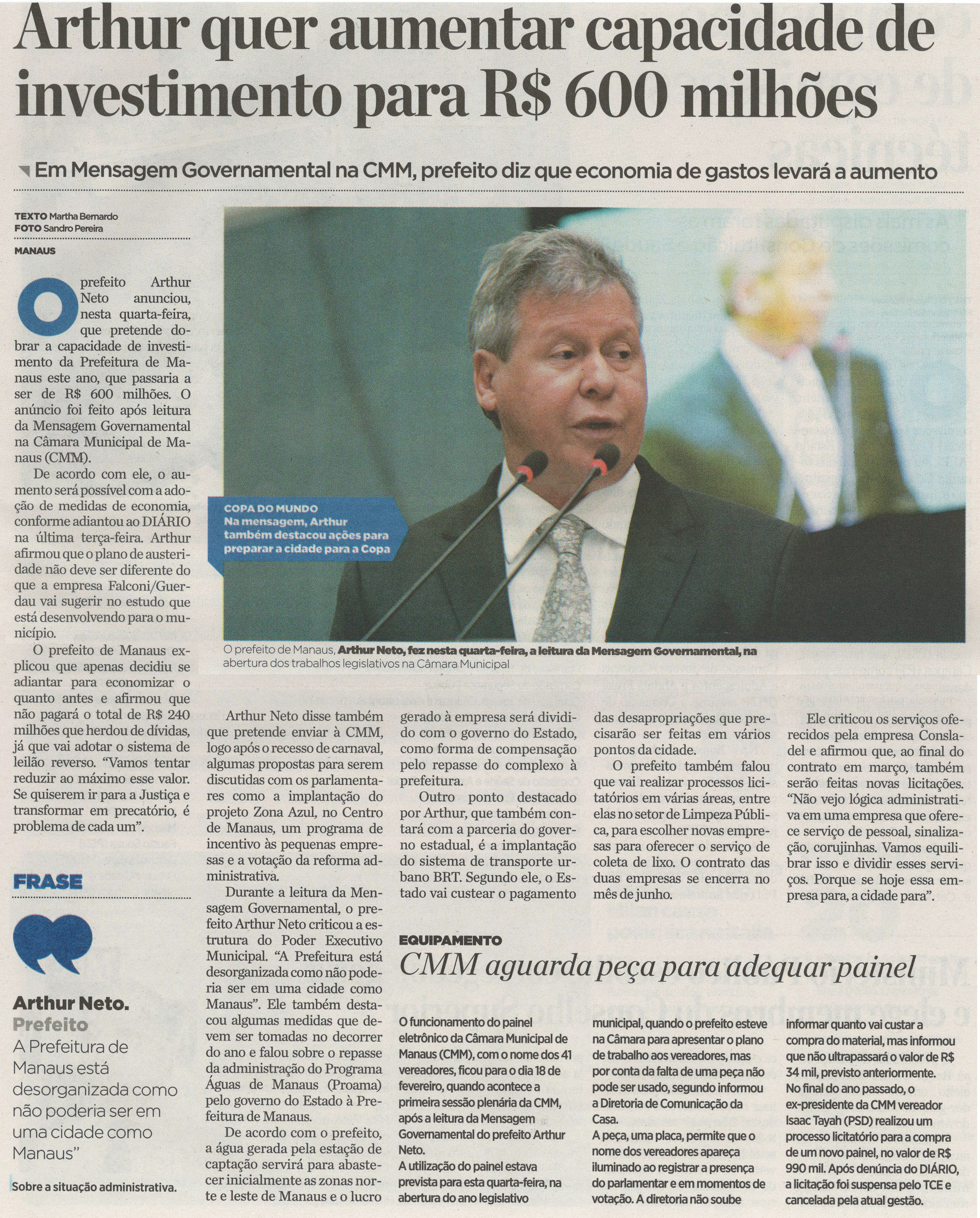 Arthur quer aumentar capacidade de investimento para R$ 600 milhões |