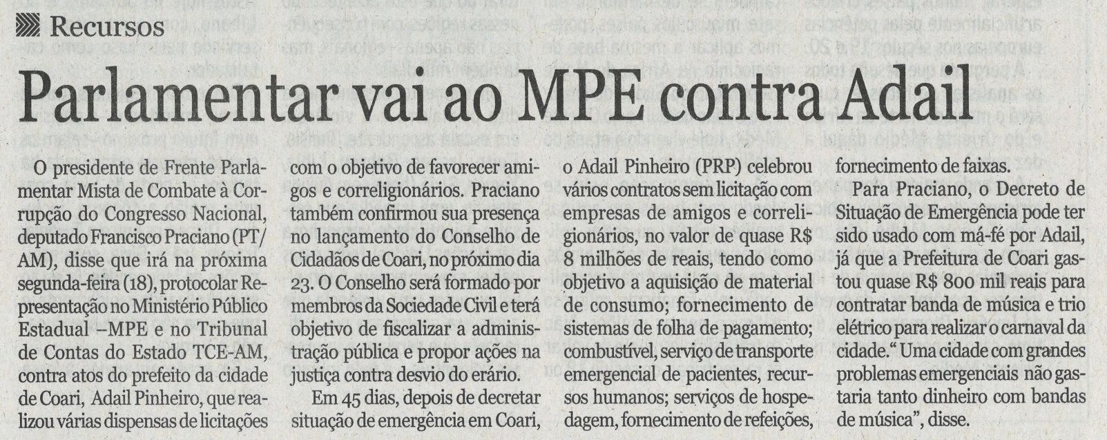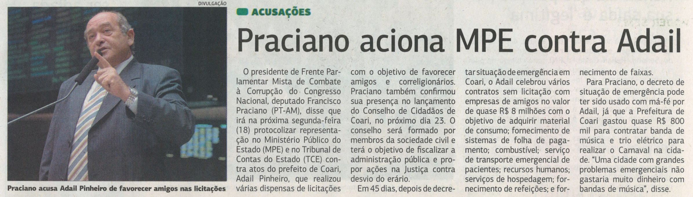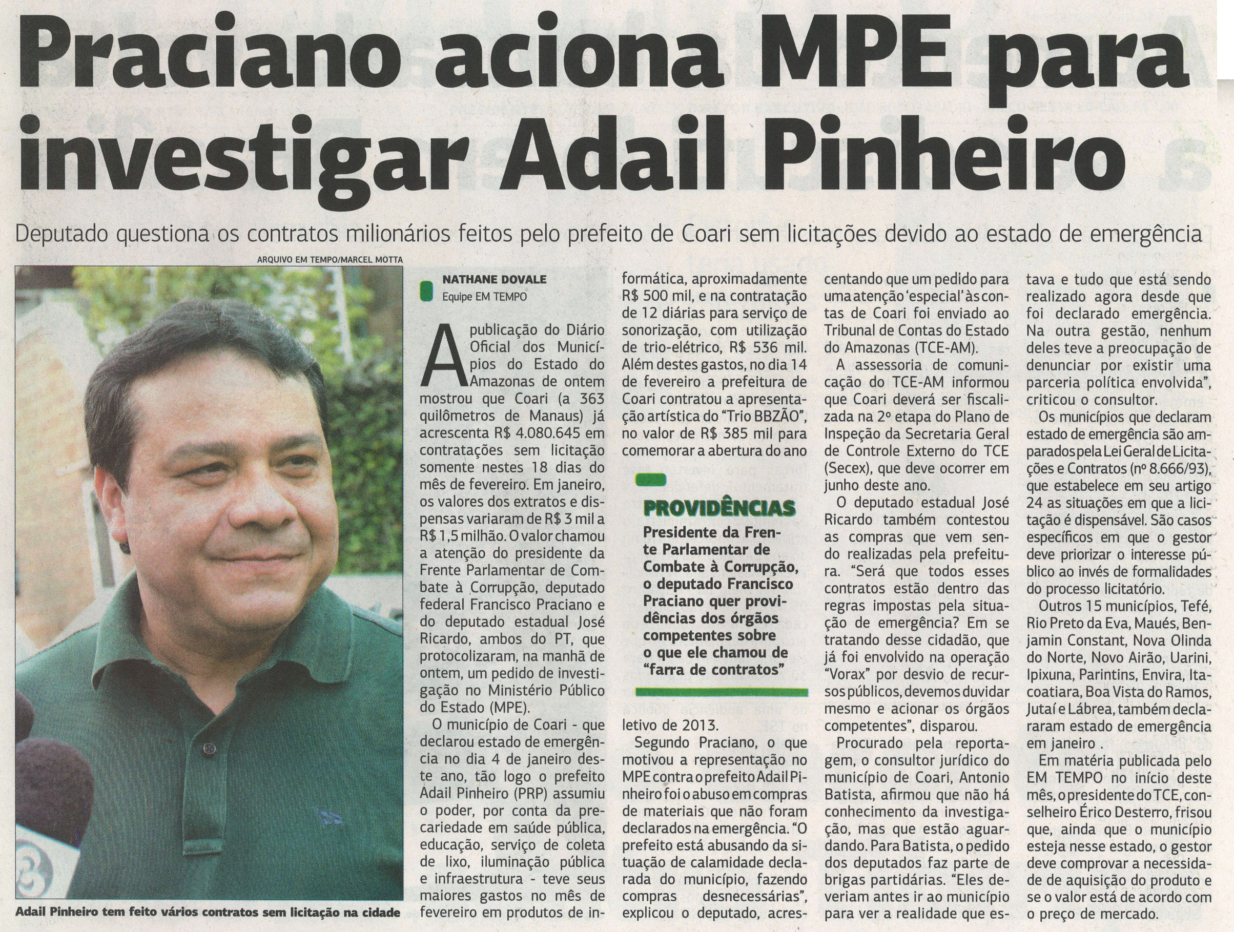 Praciano aciona MPE para investigar Adail Pinheiro |