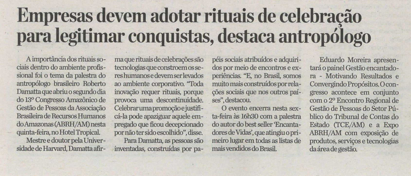 4/10/13 Diário do Amazonas Empresas devem adotar rituais de celebração para legitimar conquistas, destaca antropólogo